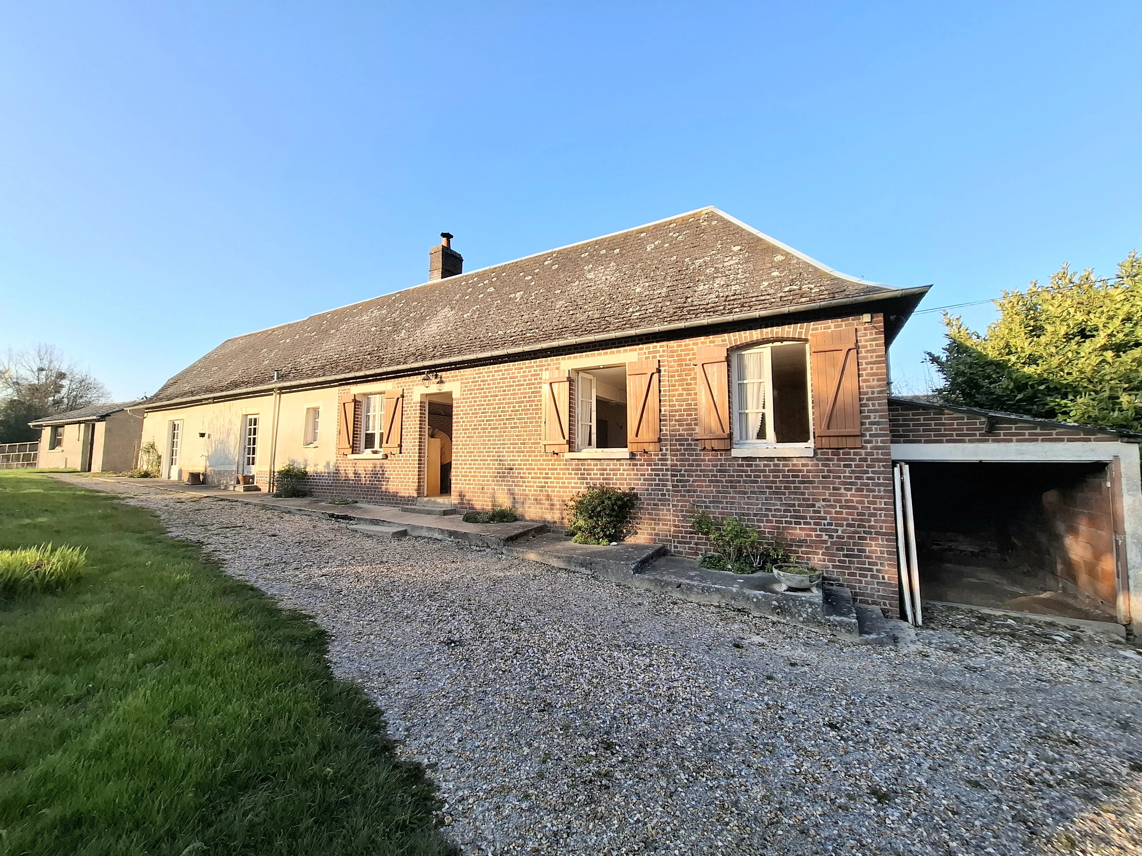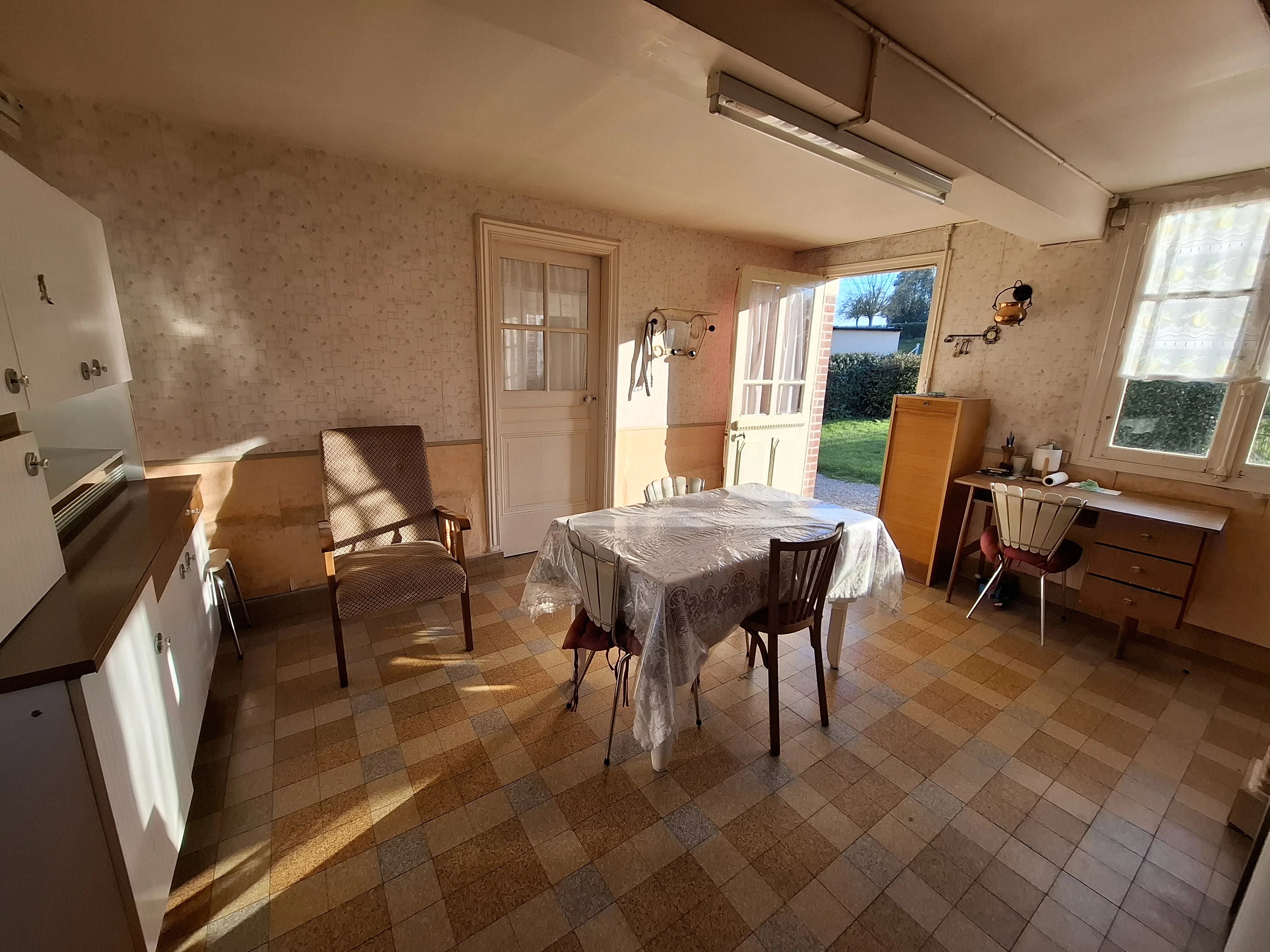 Maison ancienne comprenant : coin repas avec poêle à granulés, cuisine, séjour, 2 chambres, salle d’eau avec WC. Grenier, garage, atelier et dépendances.