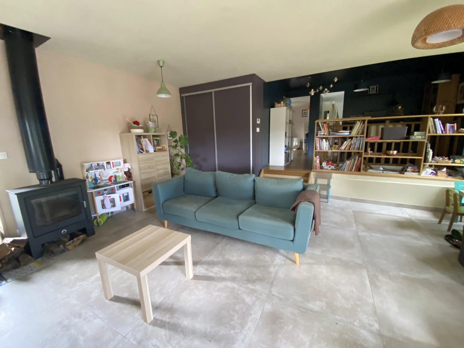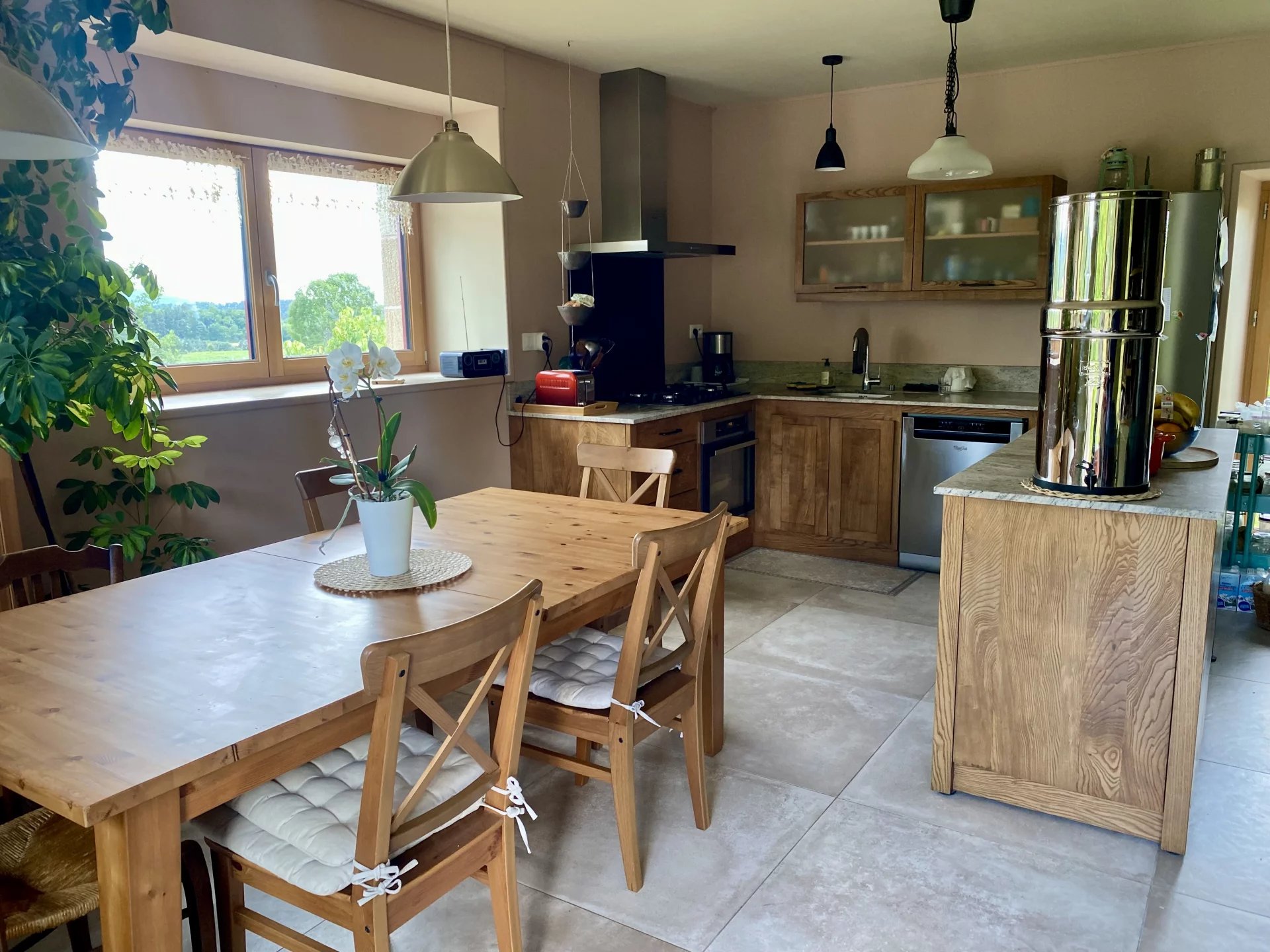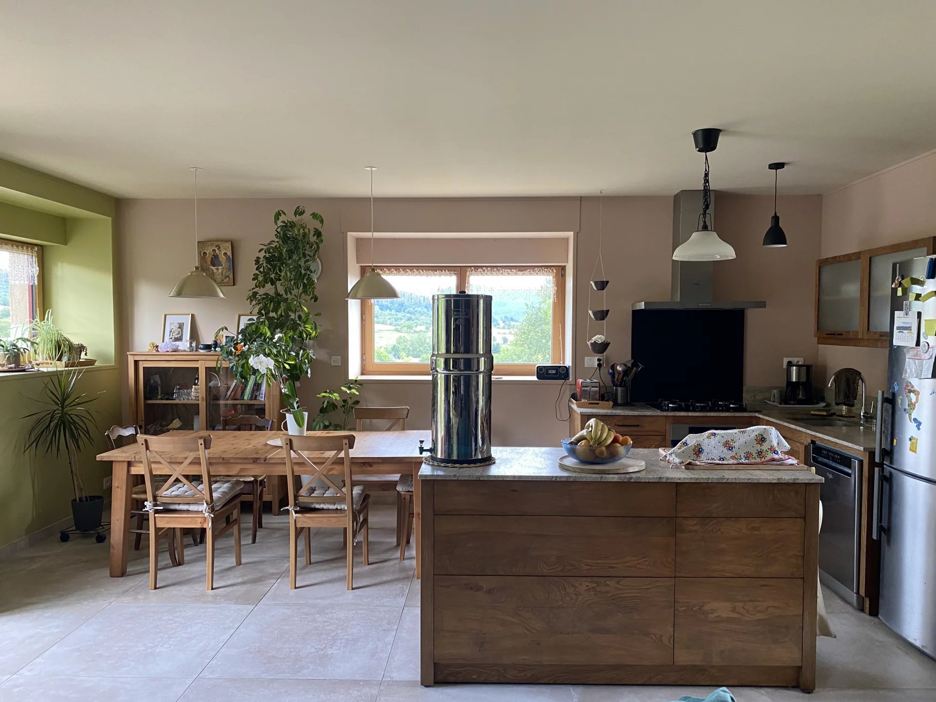 - À l’étage, étant aussi accessible par l’extérieur grâce à la montée de grange et sa terrasse de 18 m2, un séjour de 60 m2 avec cuisine équipée ouverte, réalisée sur mesure par un ébéniste, palier/bibliothèque de 5 m2, environ desservant deux chambres de 13 et 12.5 m2 ainsi qu’une salle d’eau avec WC de 5 m2. Un poêle à bois est présent dans le séjour, ainsi que des stores électriques.