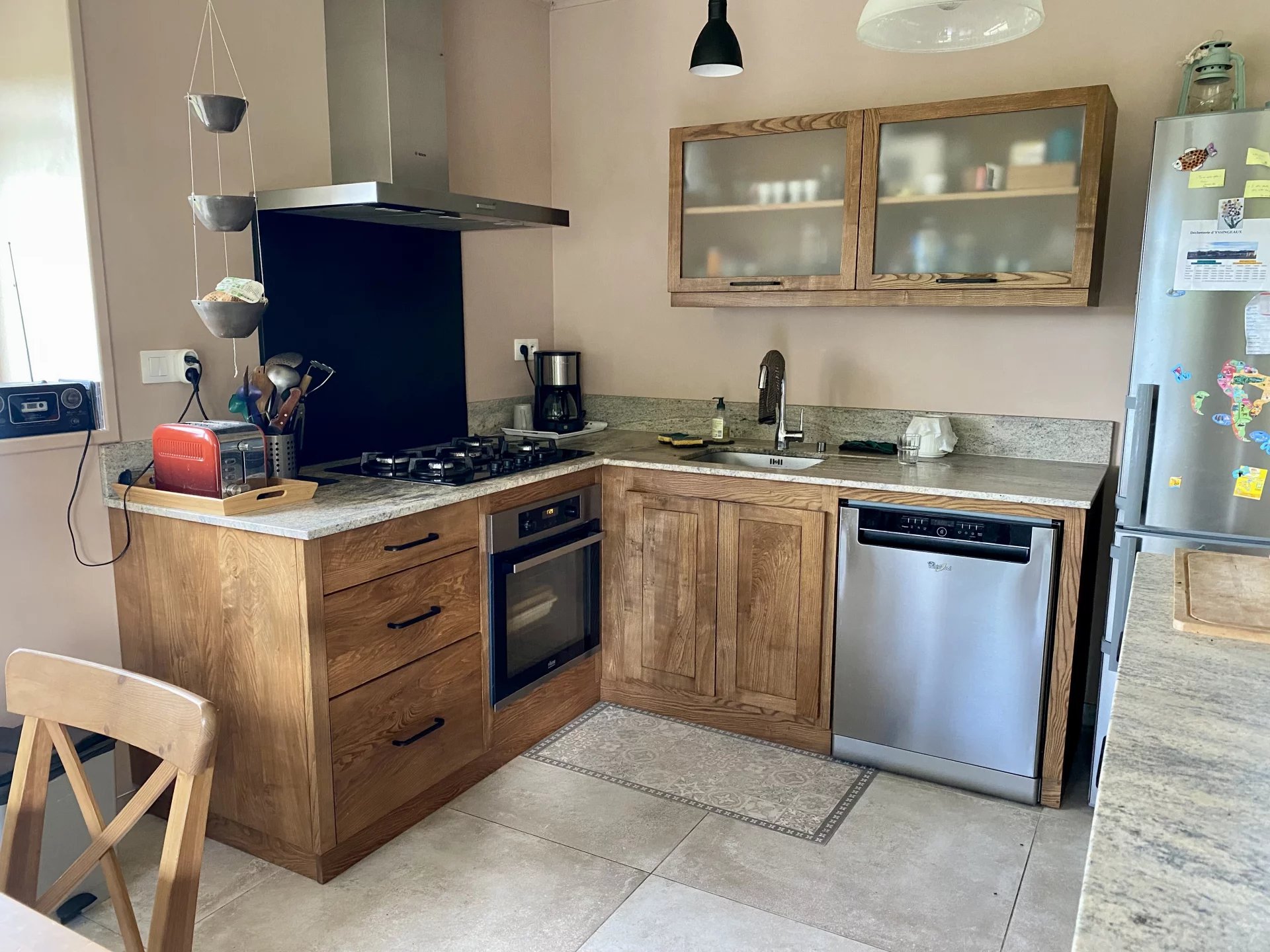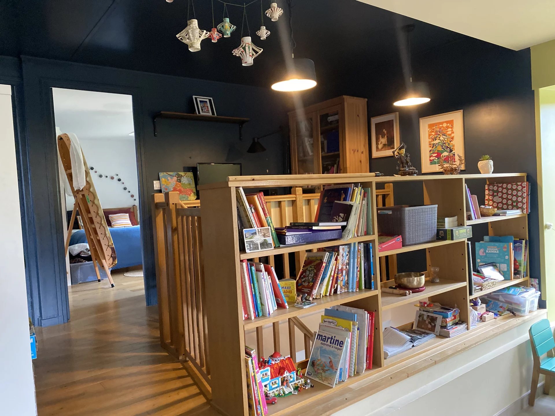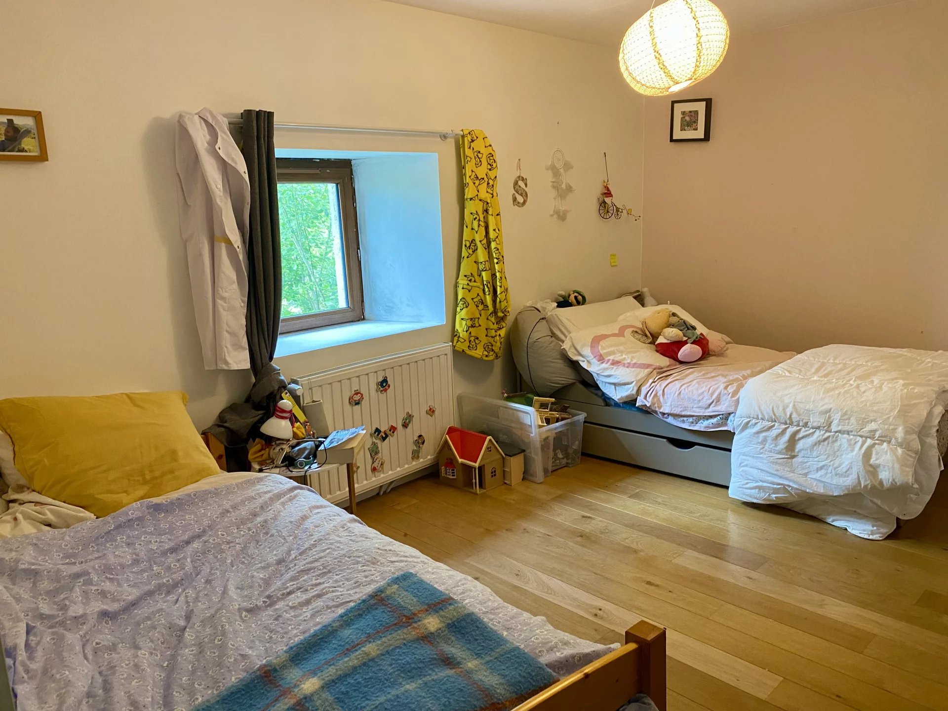 - À l’étage, étant aussi accessible par l’extérieur grâce à la montée de grange et sa terrasse de 18 m2, un séjour de 60 m2 avec cuisine équipée ouverte, réalisée sur mesure par un ébéniste, palier/bibliothèque de 5 m2, environ desservant deux chambres de 13 et 12.5 m2 ainsi qu’une salle d’eau avec WC de 5 m2. Un poêle à bois est présent dans le séjour, ainsi que des stores électriques.