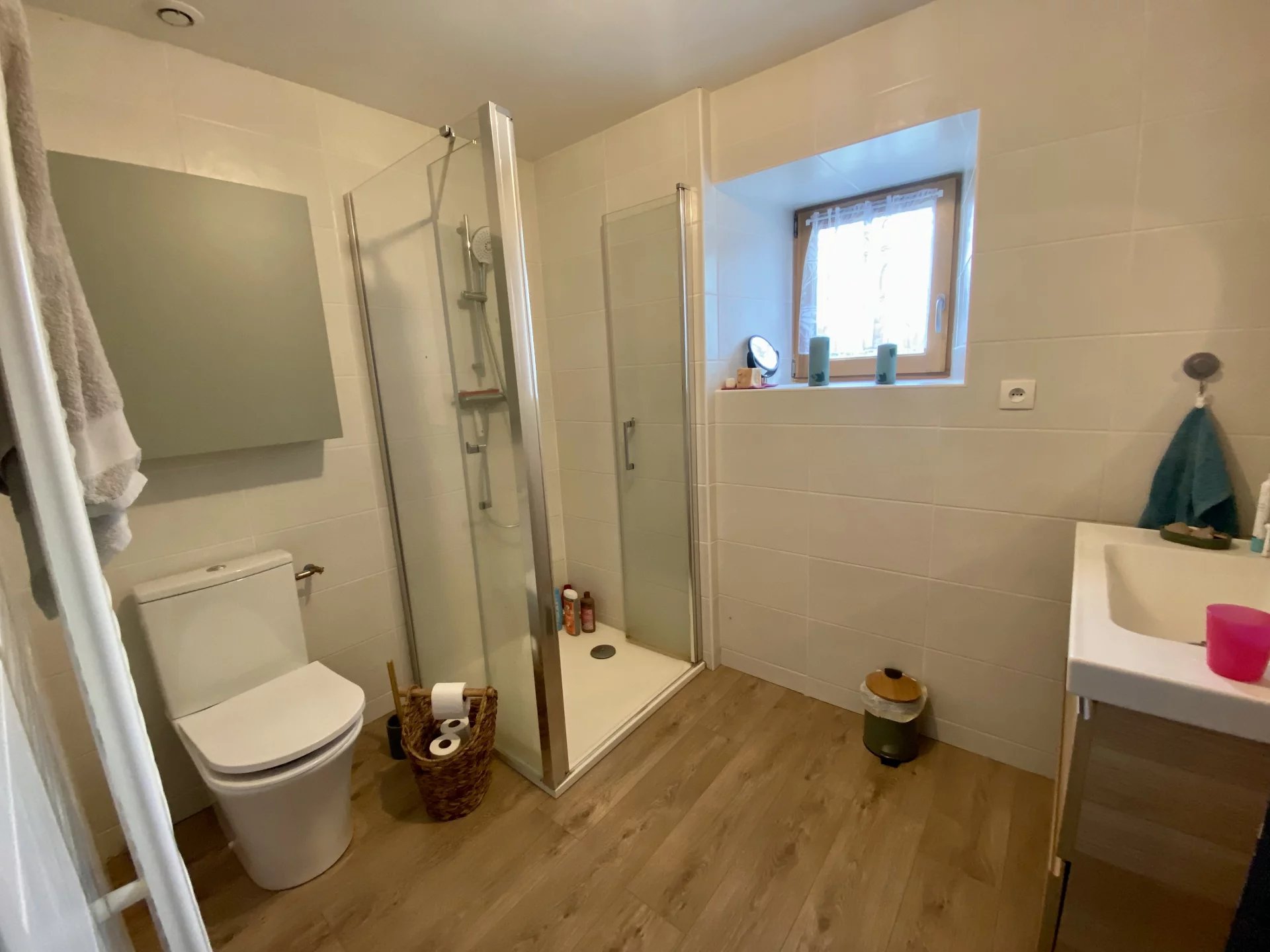 - Rez-de-jardin : suite parentale de 27.3 m2 avec salle d’eau et toilettes. Concernant la salle d’eau, toute l’installation est faite pour recevoir une douche. Ensuite un bureau de 7.9 m2.