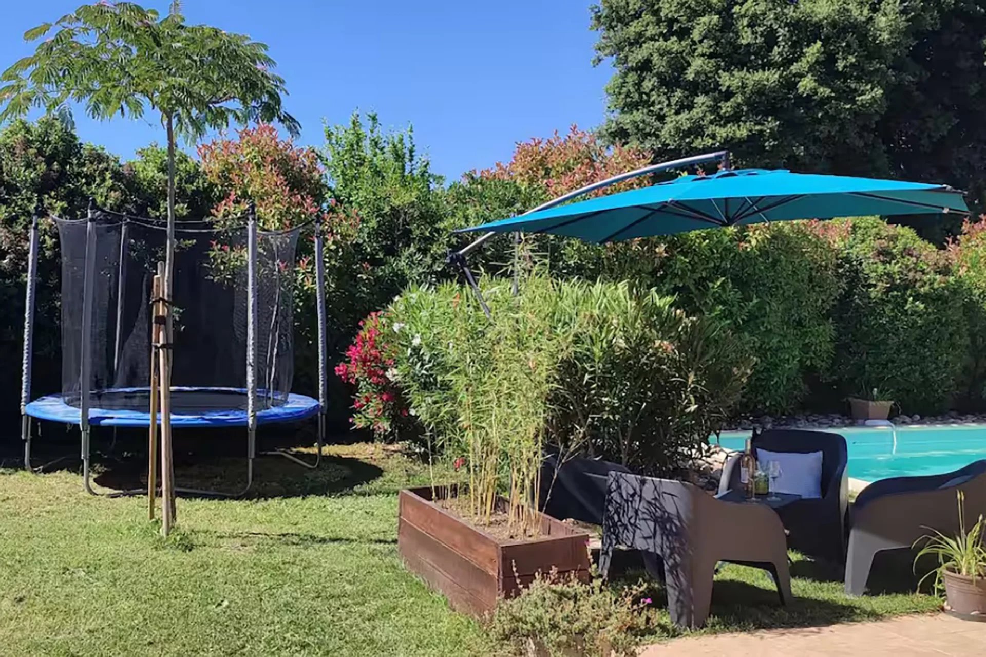 À l’extérieur, place à la détente : une piscine, une pergola ombragée, et un cadre très agréable, sans vis-à-vis. On s’y sent tout de suite bien.