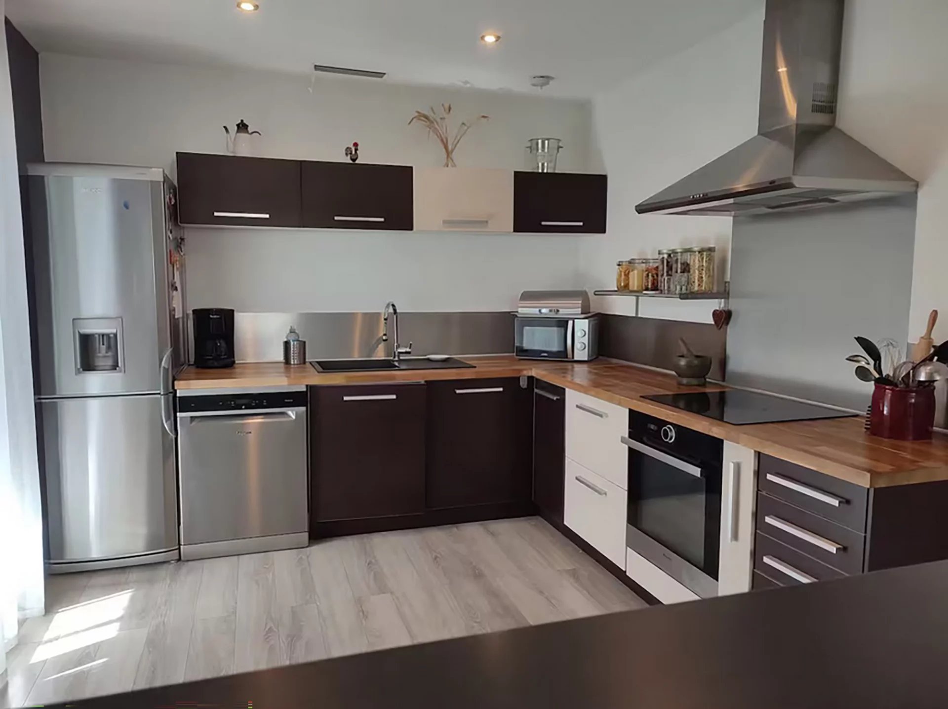 La cuisine est entièrement équipée, ouverte sur le salon, idéale pour partager des moments conviviaux en famille ou entre amis.