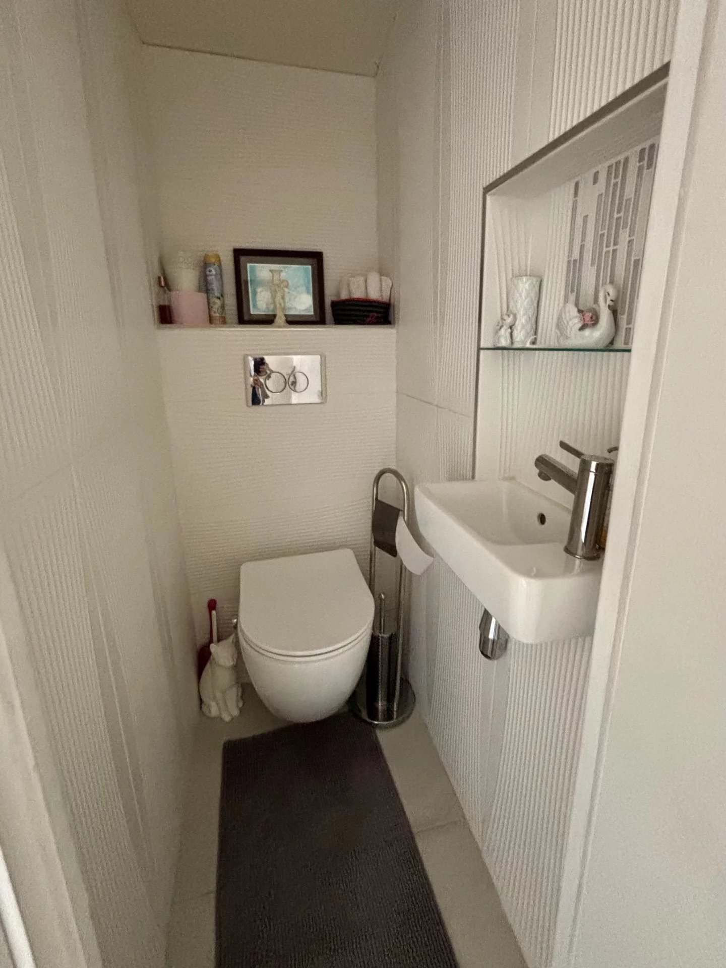 La grande chambre bénéficie également de son propre balcon, tandis que la salle d’eau, élégamment rénovée, est équipée d’une douche à l’italienne. Un WC indépendant complète l’ensemble.