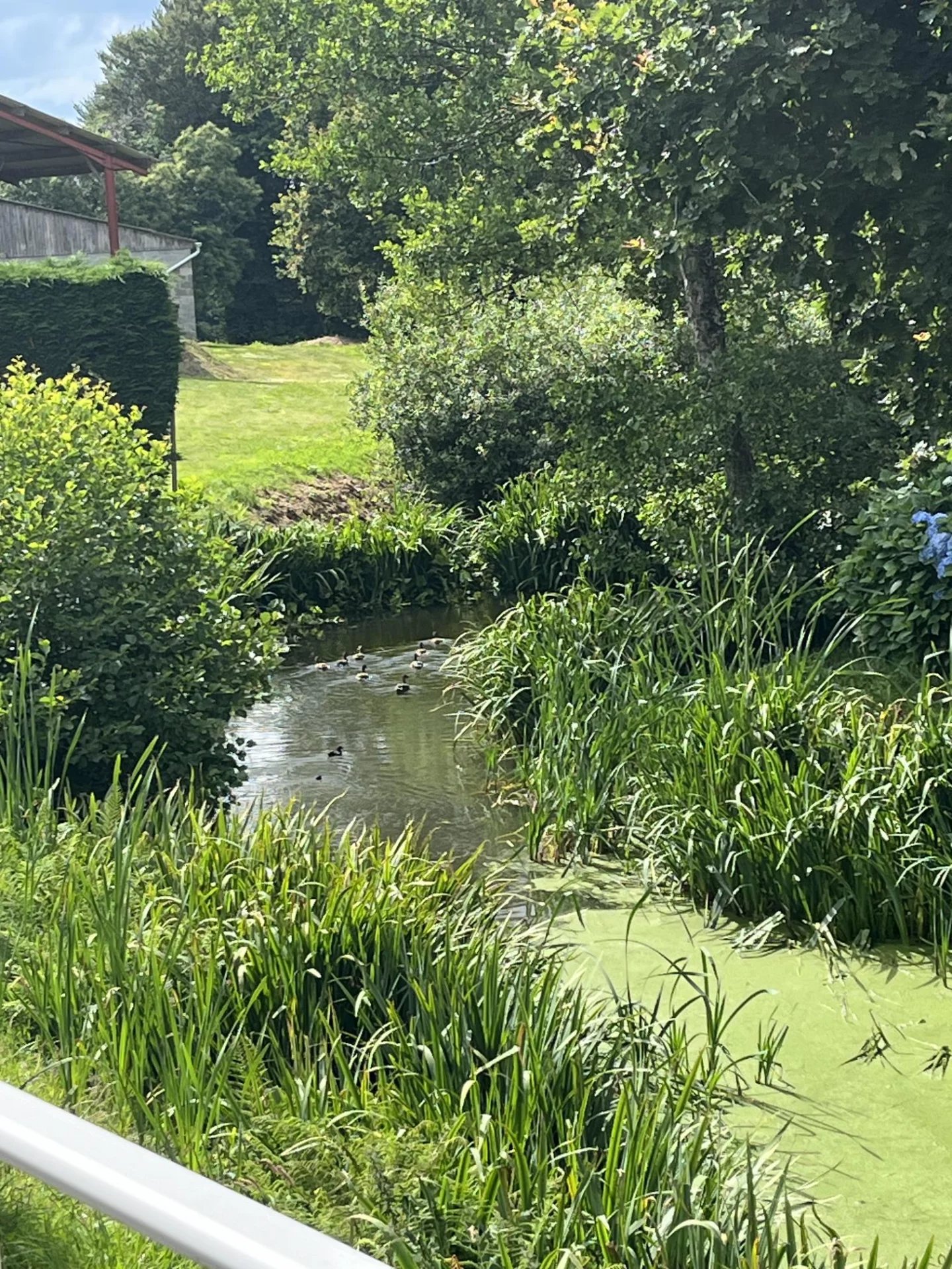 À l'extérieur : un joli jardin arboré, une terrasse surélevée, un abri sous terrasse, un étang, un puits, un garage et un carport.