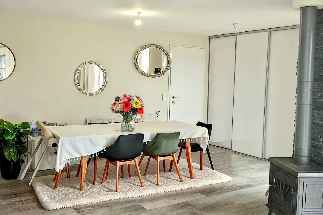 - au rez-de-chaussée : d'une entrée avec placards, un lumineux séjour/salon avec poêle à bois et accès à la terrasse, une cuisine aménagée et équipée, une chambre avec un espace bureau, une salle d'eau, un WC, une buanderie.