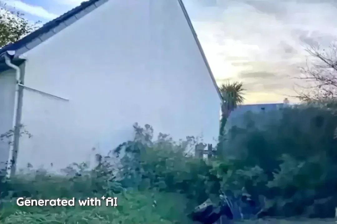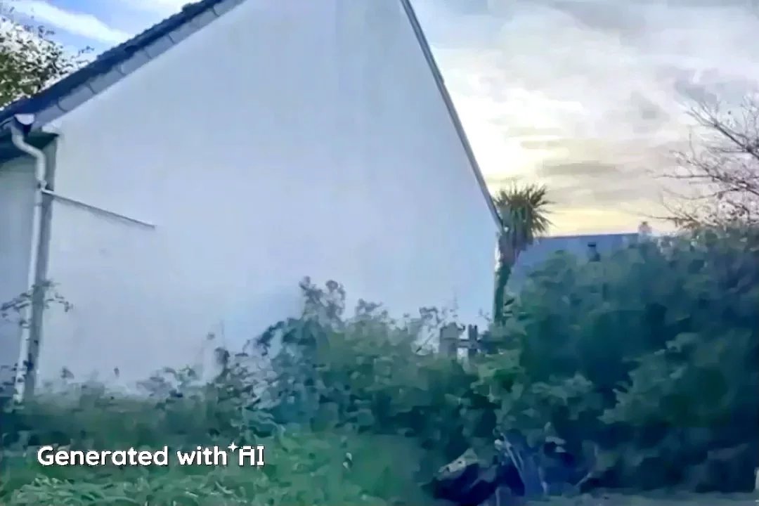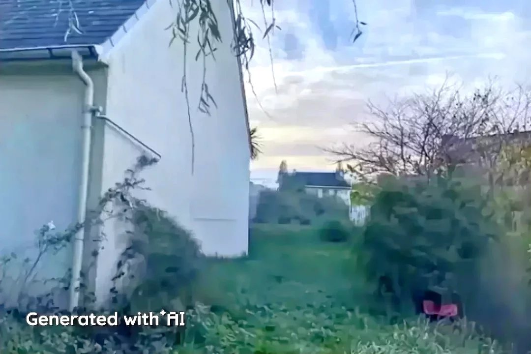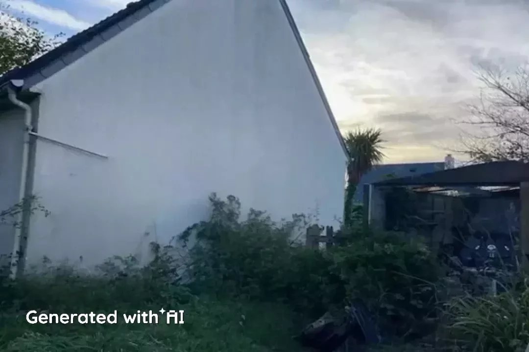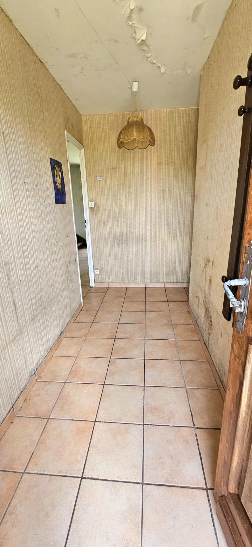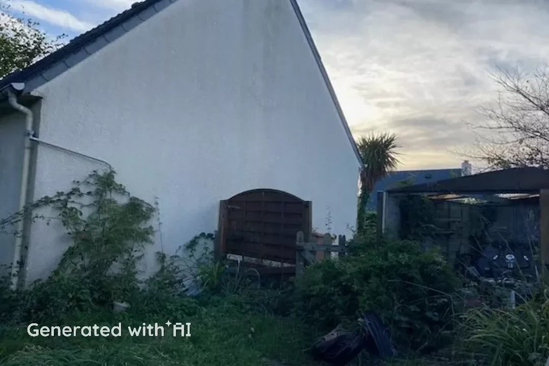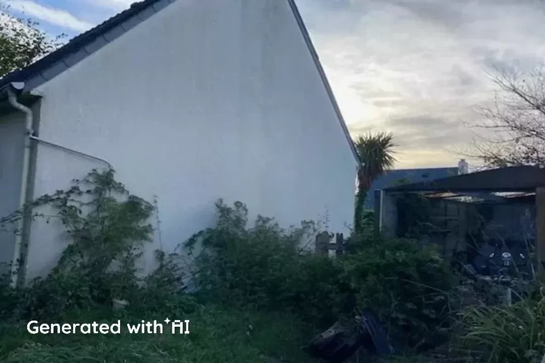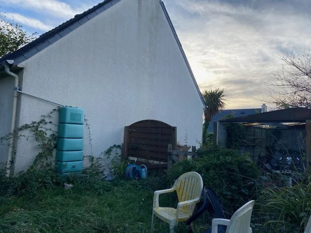 À l'extérieur : une allée bitumée, un jardin, un abri à restaurer.