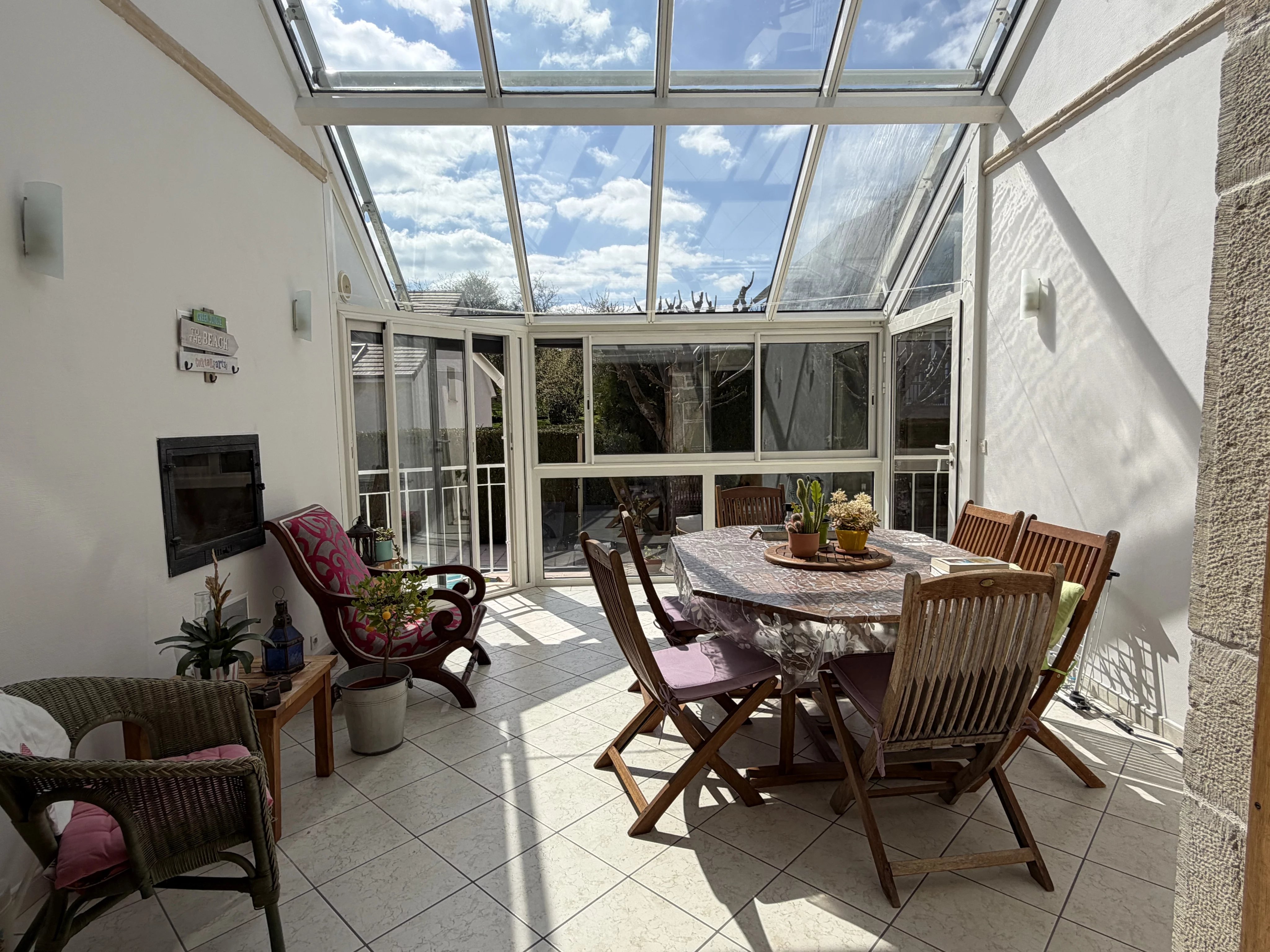 Au rez-de-jardin, une cuisine dinatoire conviviale s’ouvre sur une vaste pièce de vie lumineuse avec poêle de masse. Cet espace est prolongé par une grande véranda baignée de lumière, donnant directement sur l’extérieur.