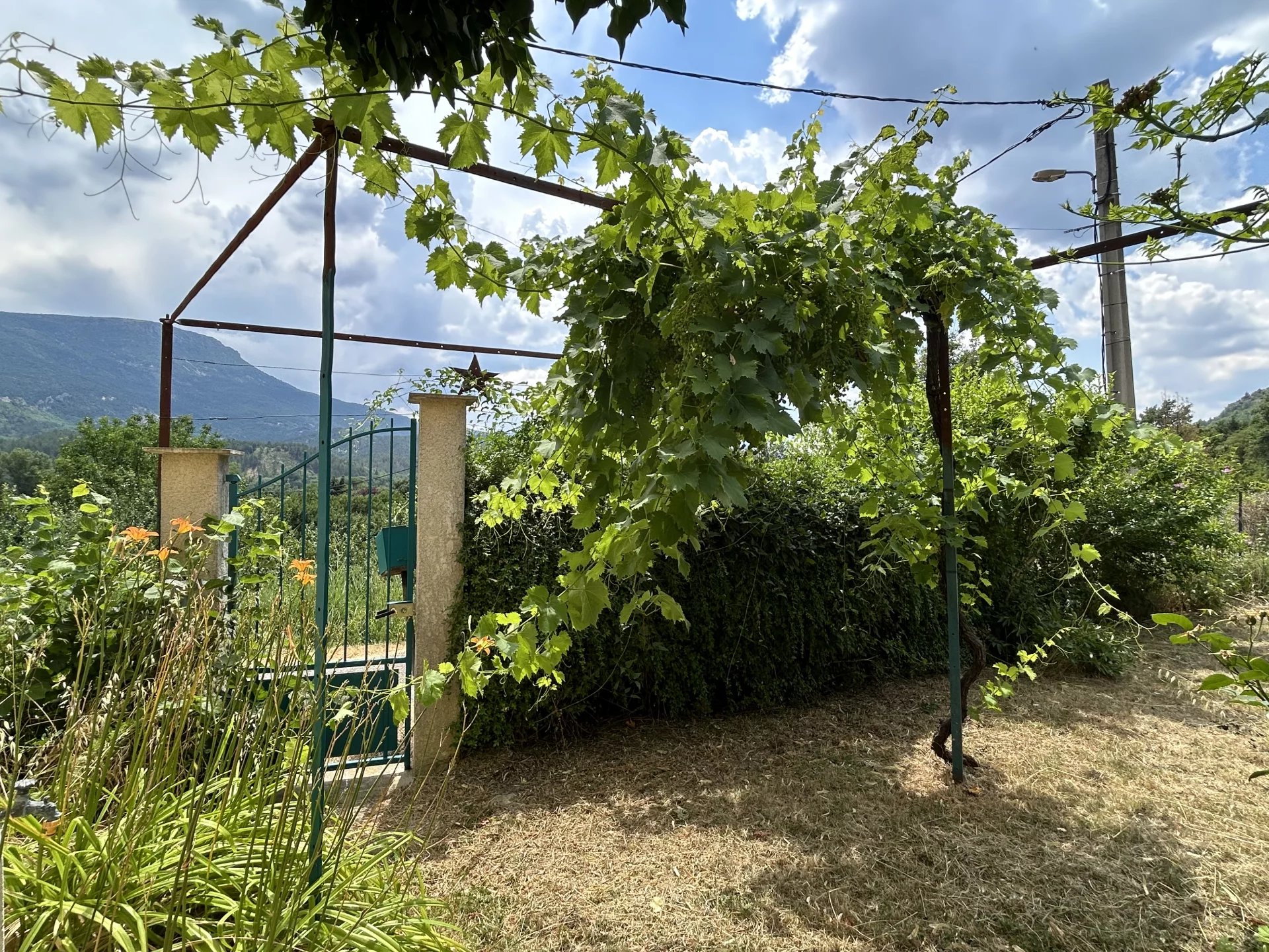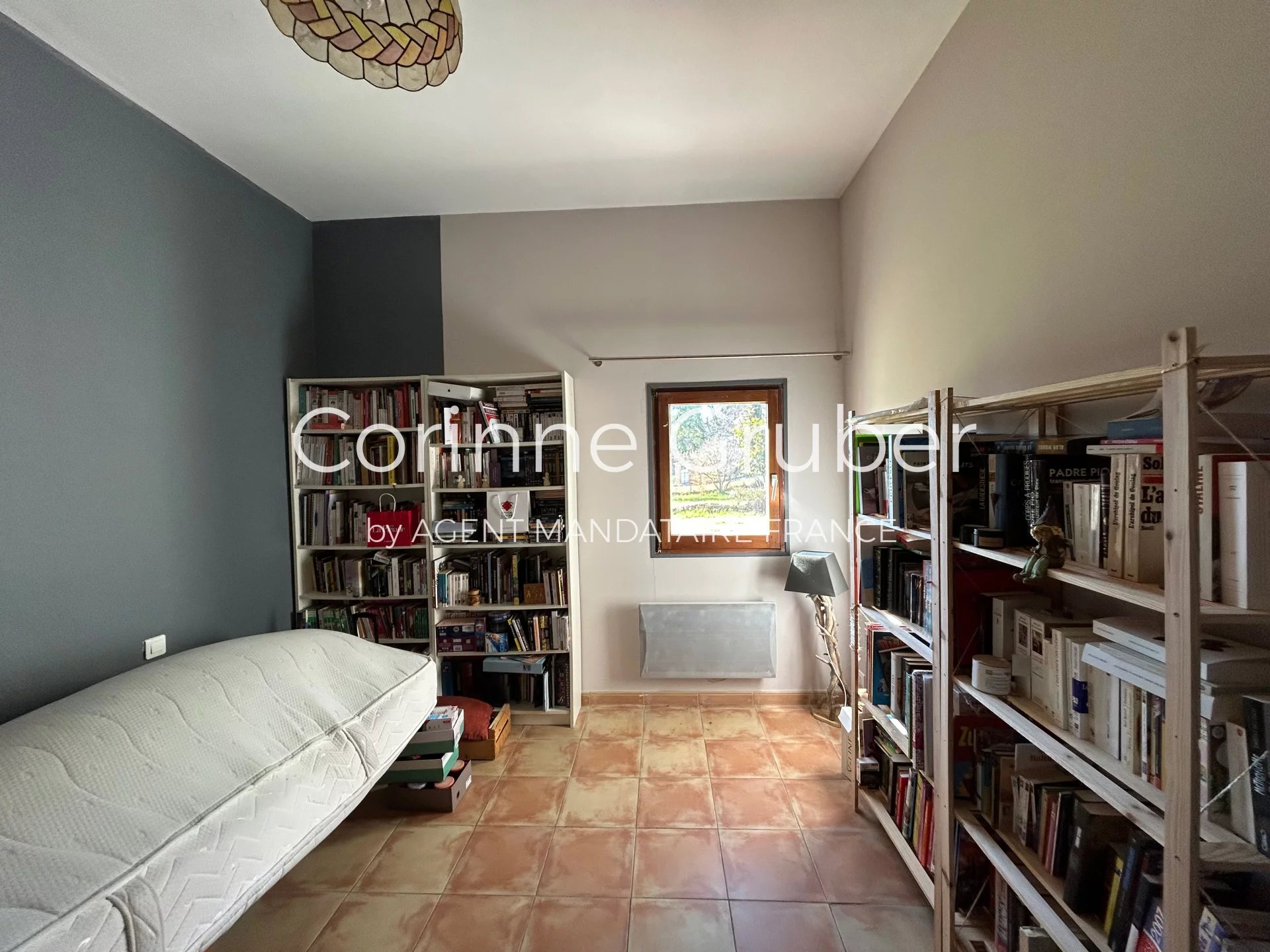 À l’extérieur, le terrain offre une végétation variée avec une petite oliveraie de 10 oliviers produisant entre 25 et 30 kg par an, ainsi que des vignes, pruniers, romarin, lauriers, lilas, jasmin et chèvrefeuille.
