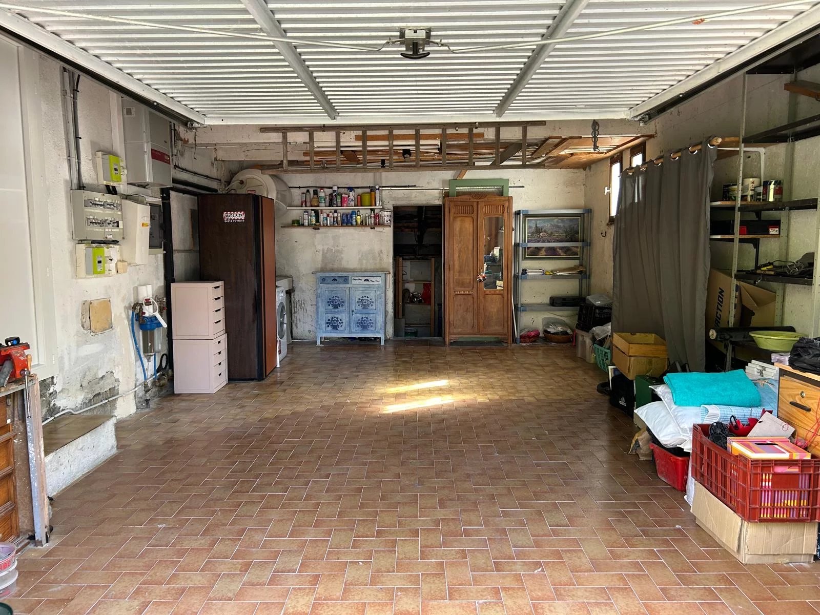 Un garage carrelé de 32 m² avec grande mezzanine et une cave de 14 m² complètent ce bien.