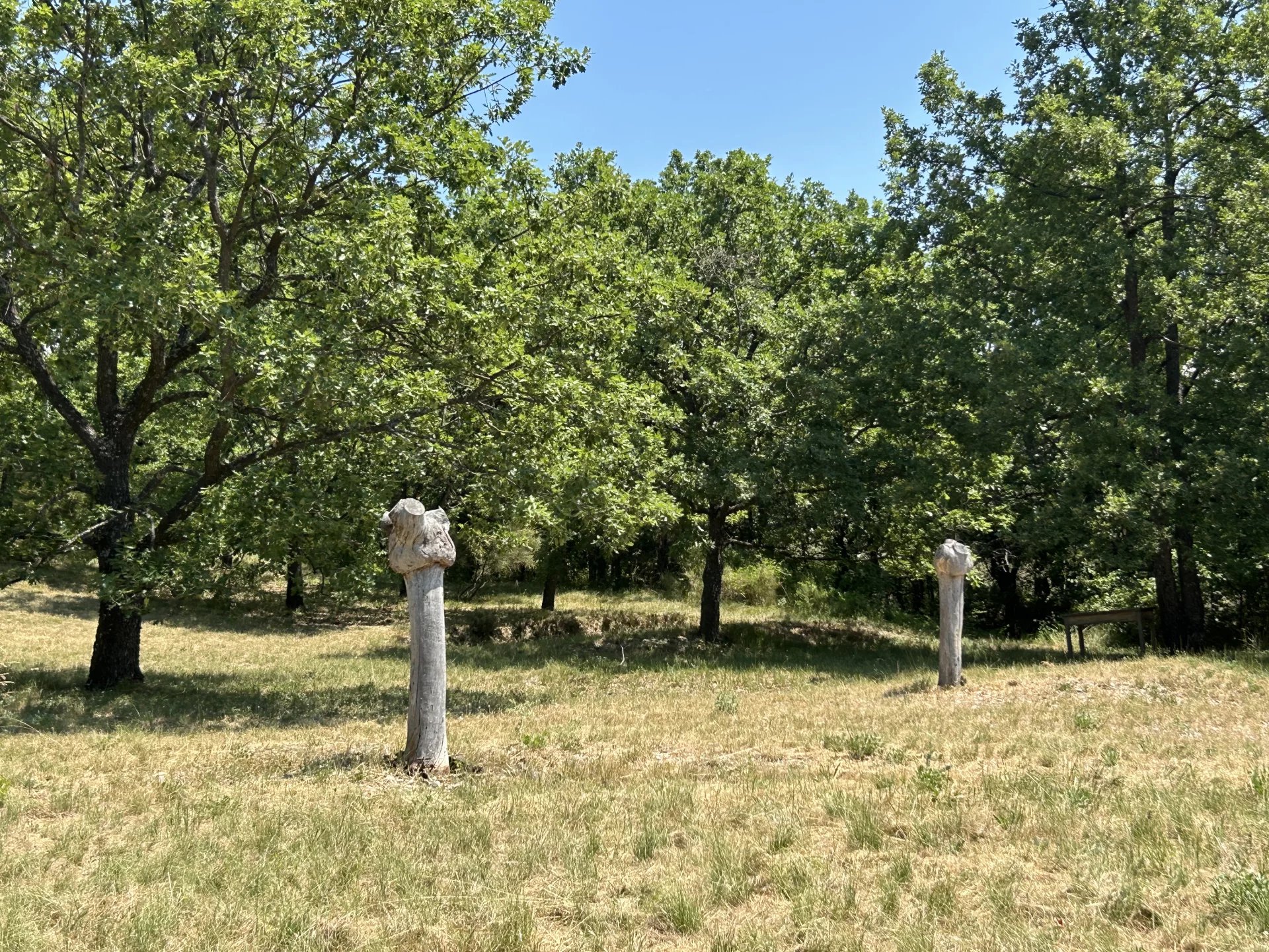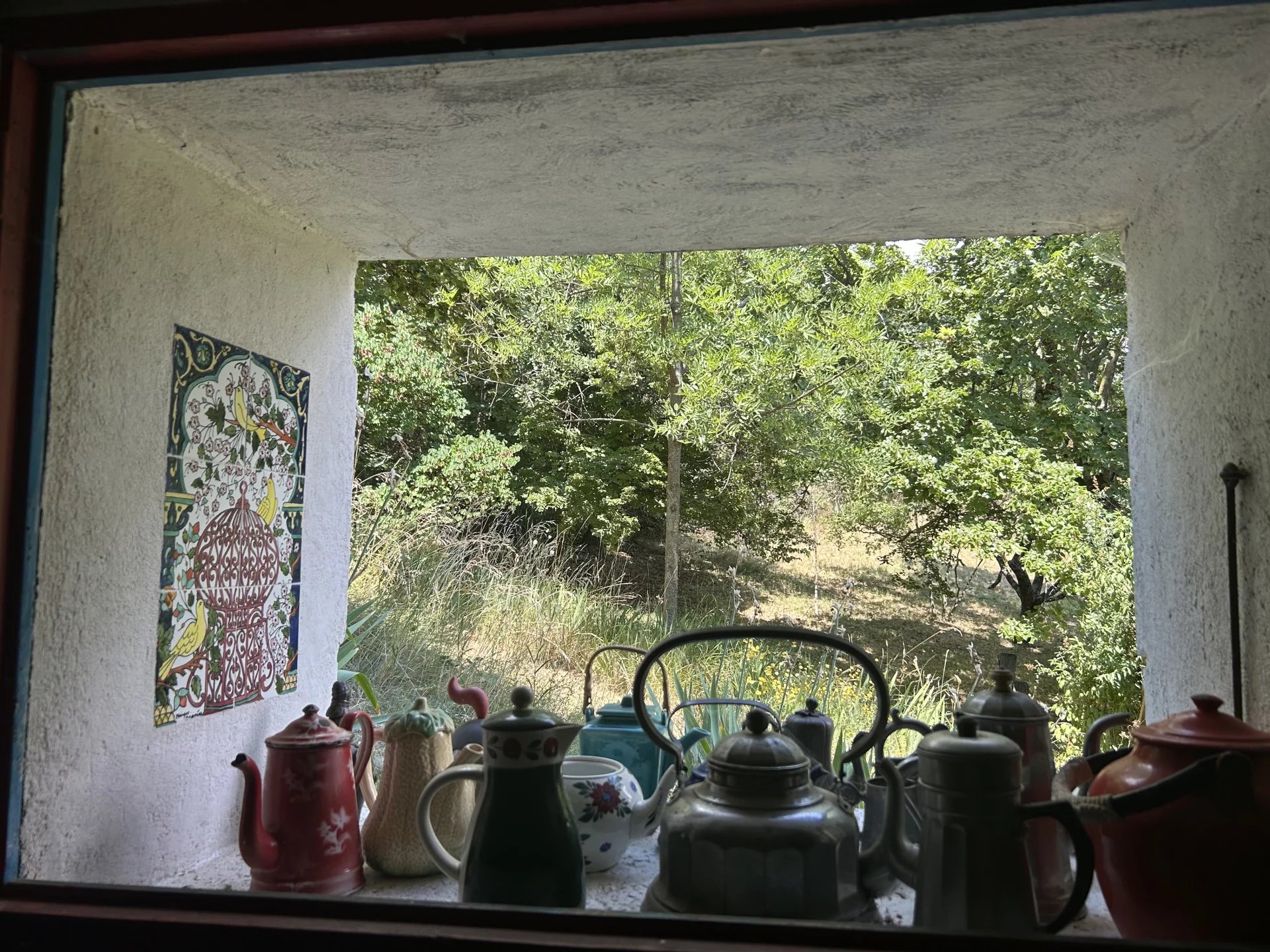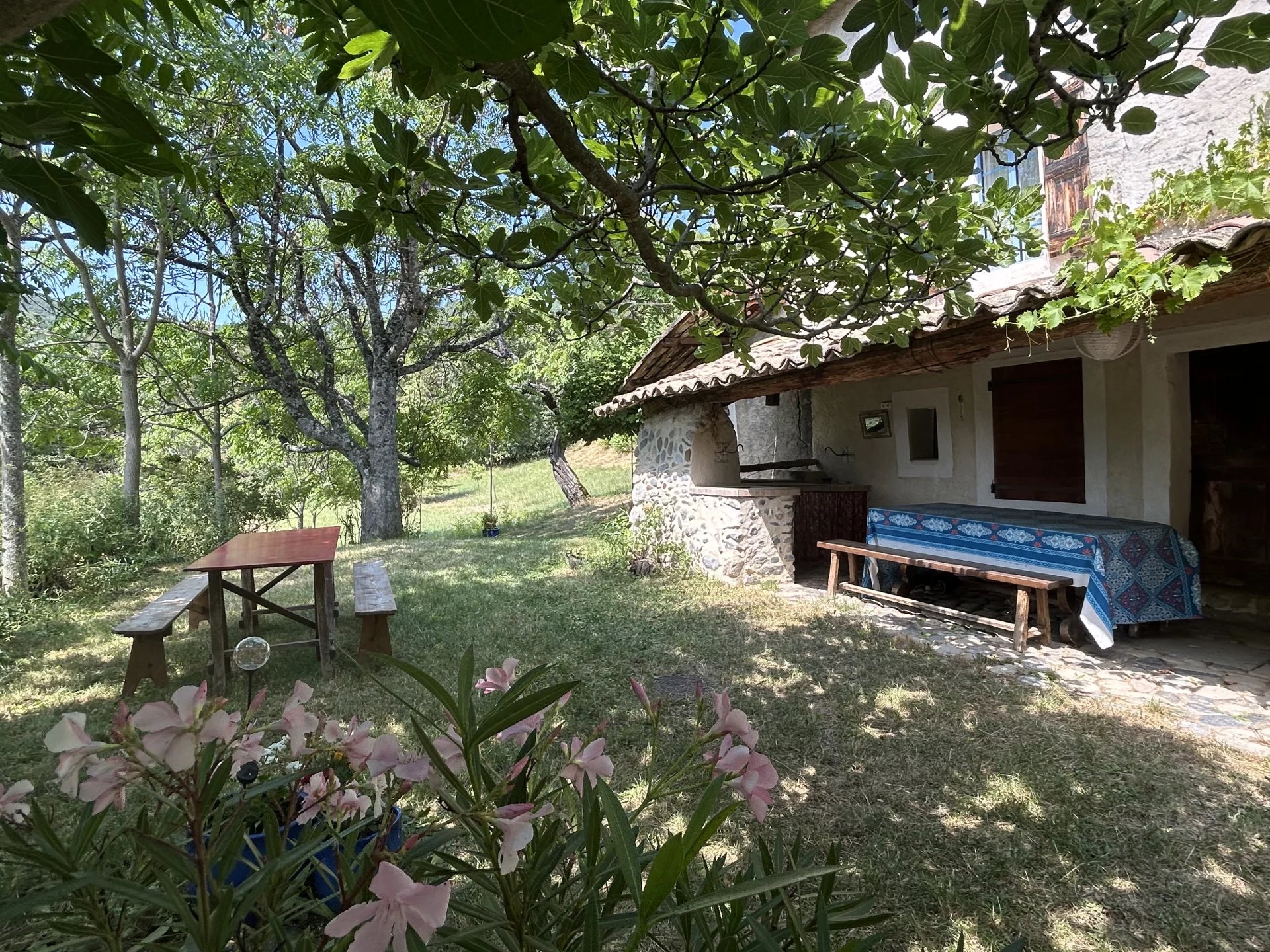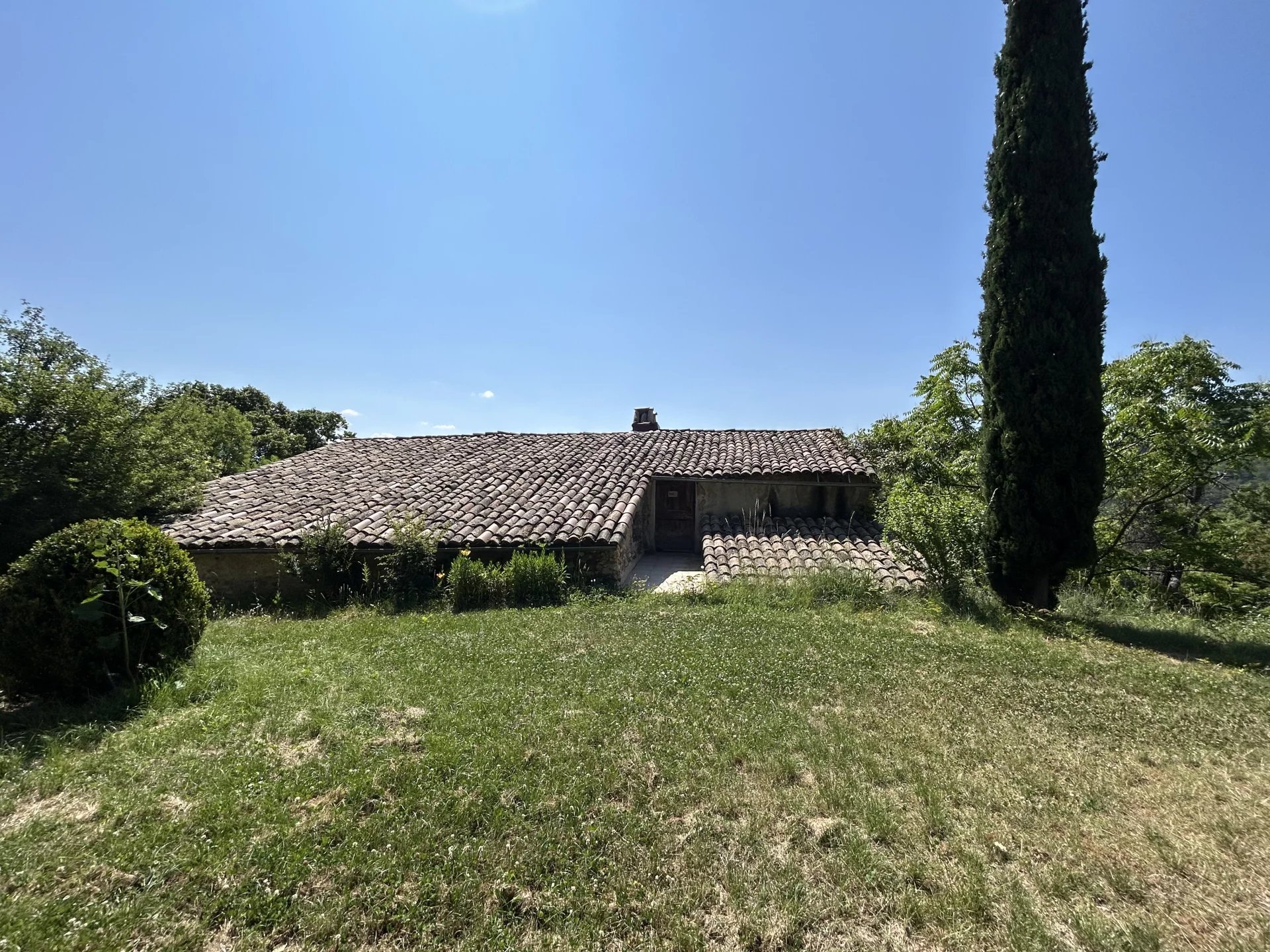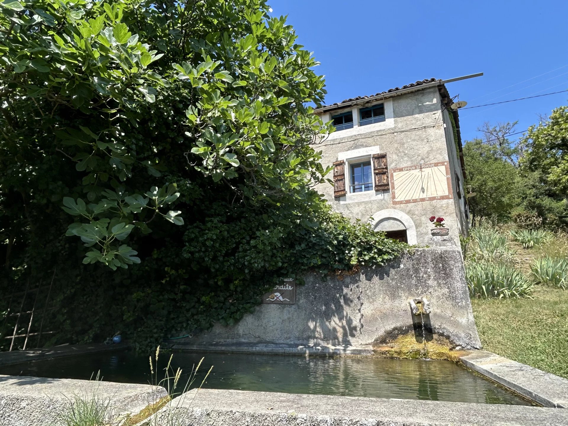 Baignée de soleil grâce à son exposition plein sud, la propriété s’étend sur plus d’un hectare de terrain arboré, avec des essences fruitières (quatre oliviers, pommiers, poiriers, cerisiers) ainsi qu'une source naturelle qui alimente une fontaine et un joli bassin devant la maison.