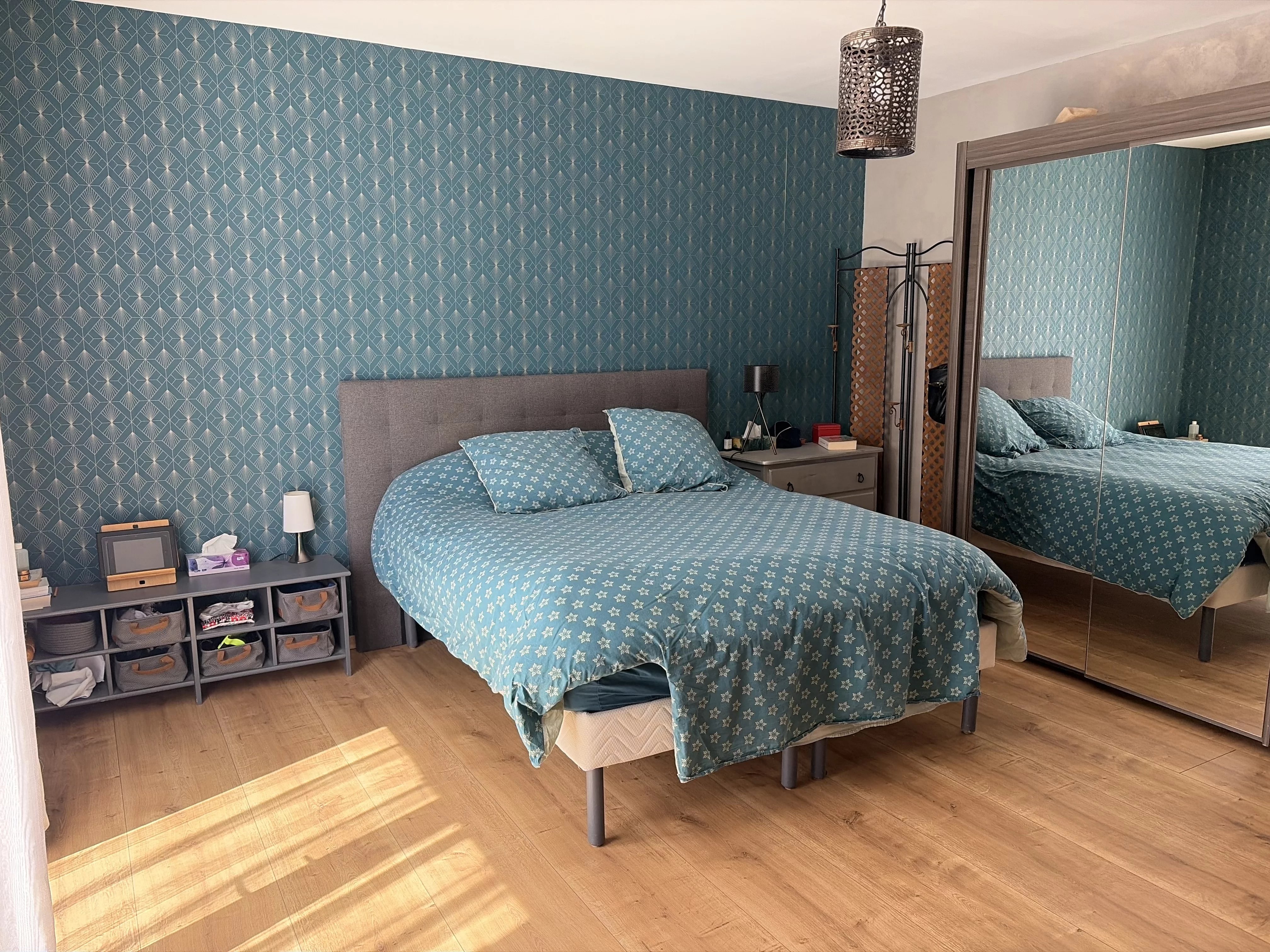 À l’étage, l’espace nuit distribue trois chambres supplémentaires ainsi qu’une grande salle de bains avec douche et toilettes, toutes orientées vers le jardin et la piscine.