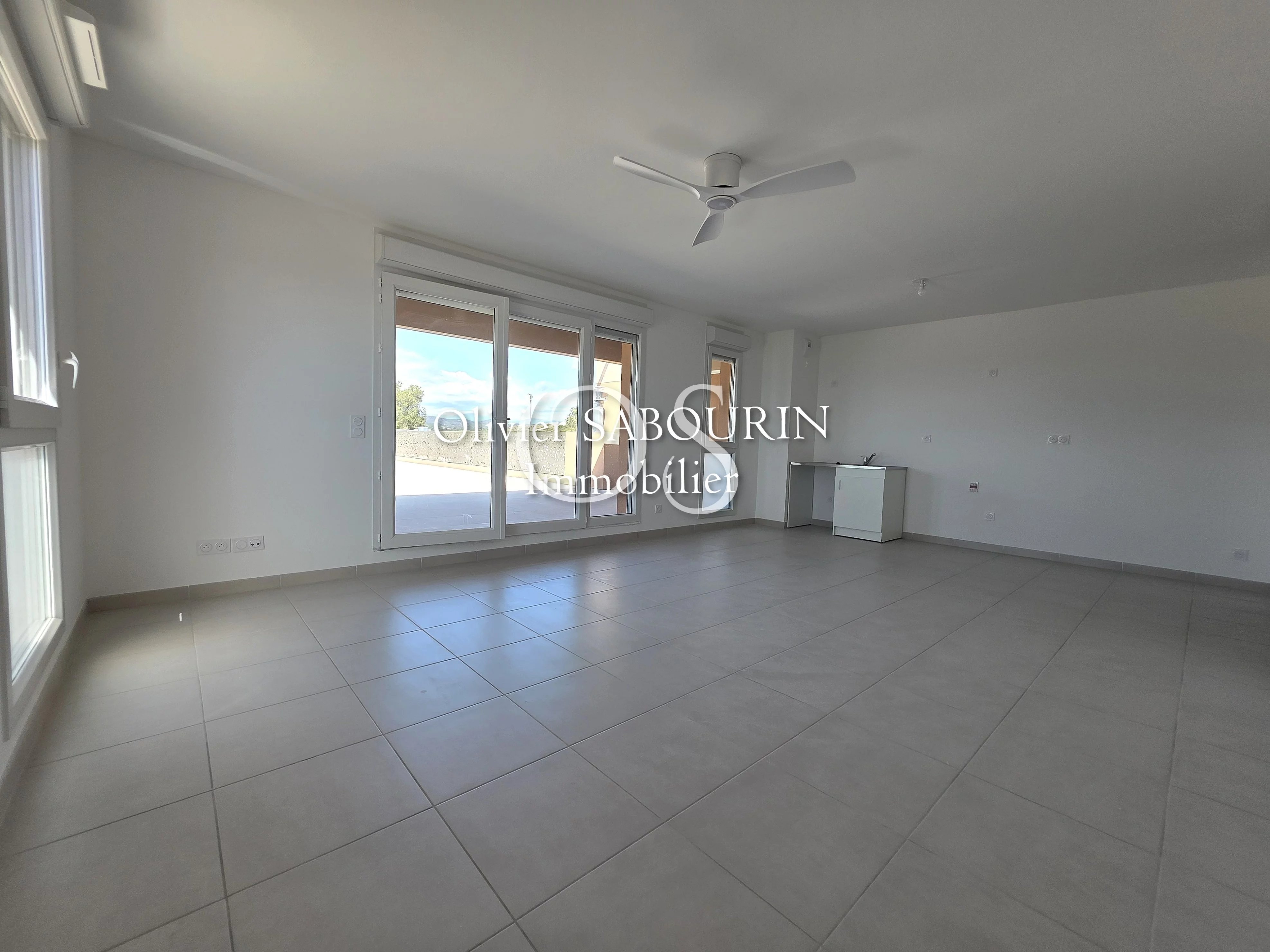 Un séjour lumineux avec espace dédié à la cuisine de 34m2 (à aménager et à équiper), ouvrant directement sur la terrasse