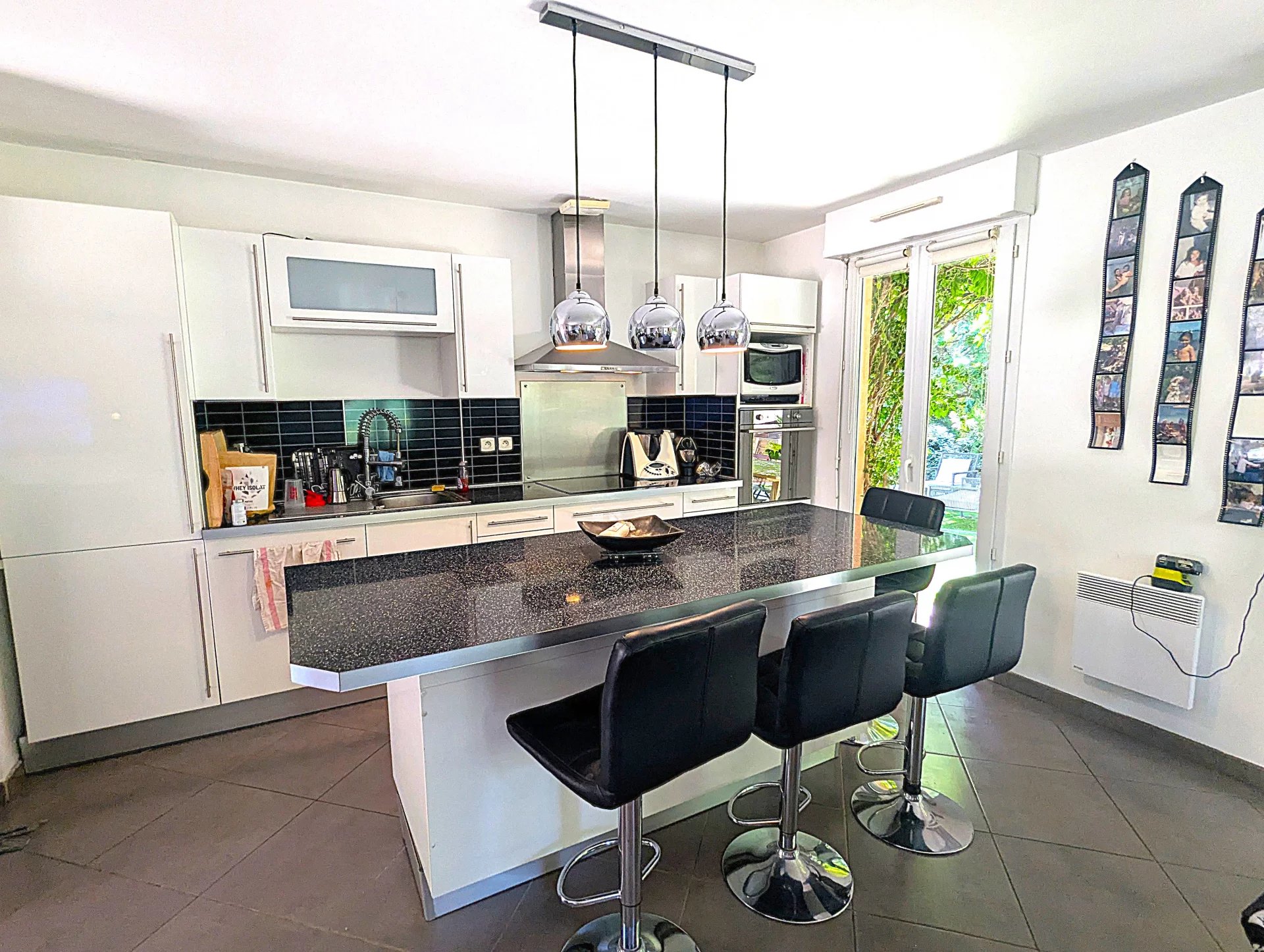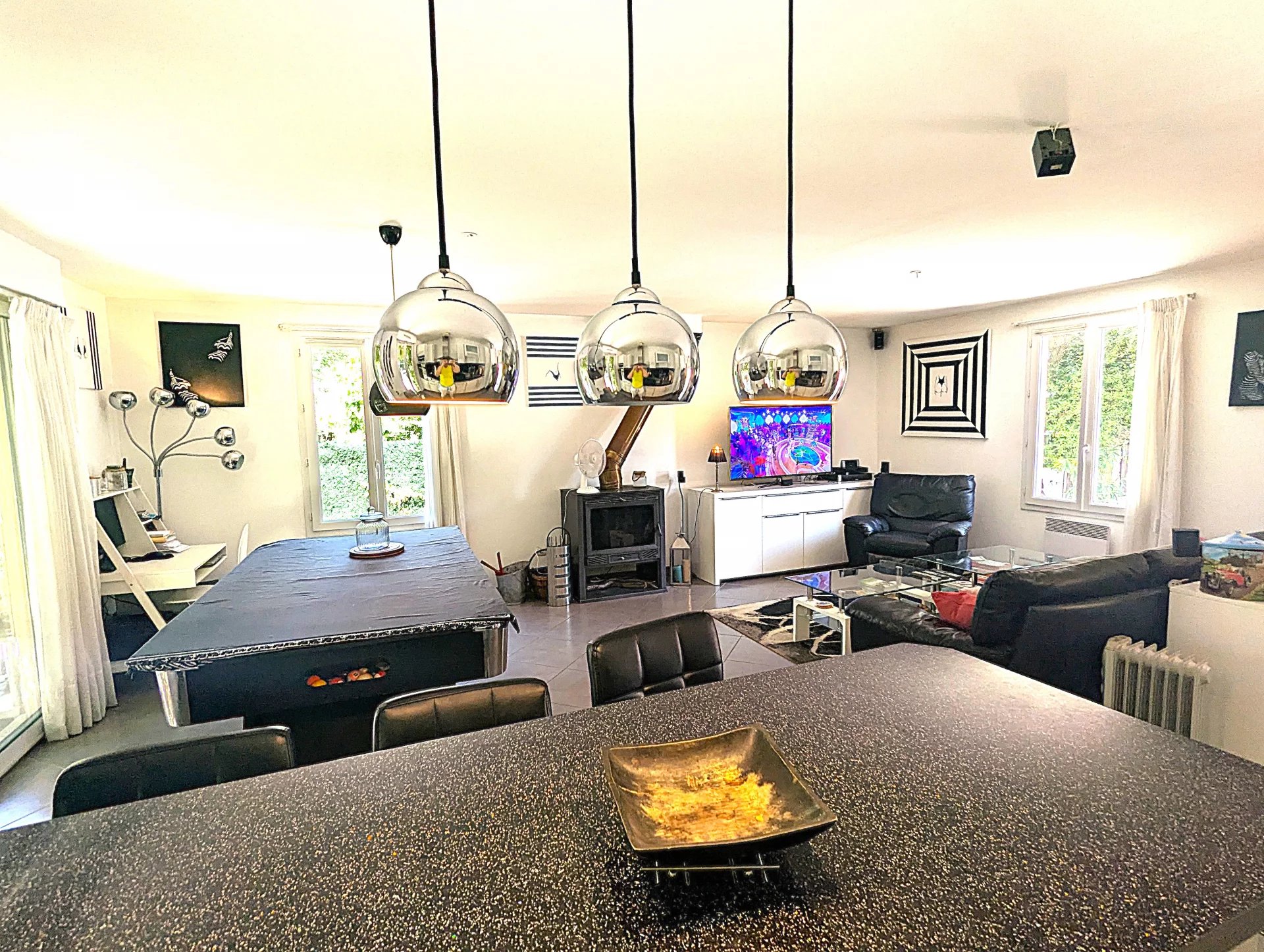 D’une surface d’environ 100 m², elle se compose d’un séjour lumineux avec poêle à bois, d’une cuisine équipée, de trois chambres, d’une buanderie, d’un WC indépendant, ainsi que d’une salle de bains complète avec baignoire balnéo, douche et double vasque.