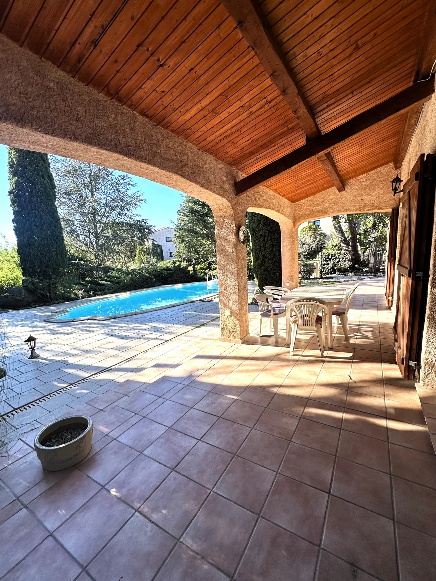 À l'extérieur une piscine, un beau jardin, une terrasse couverte et un patio.