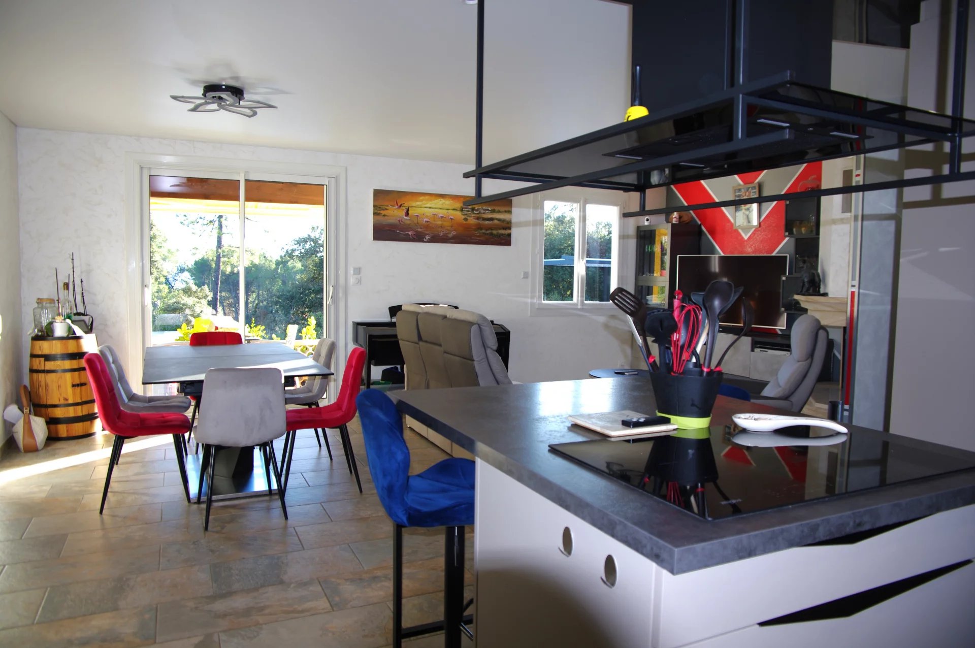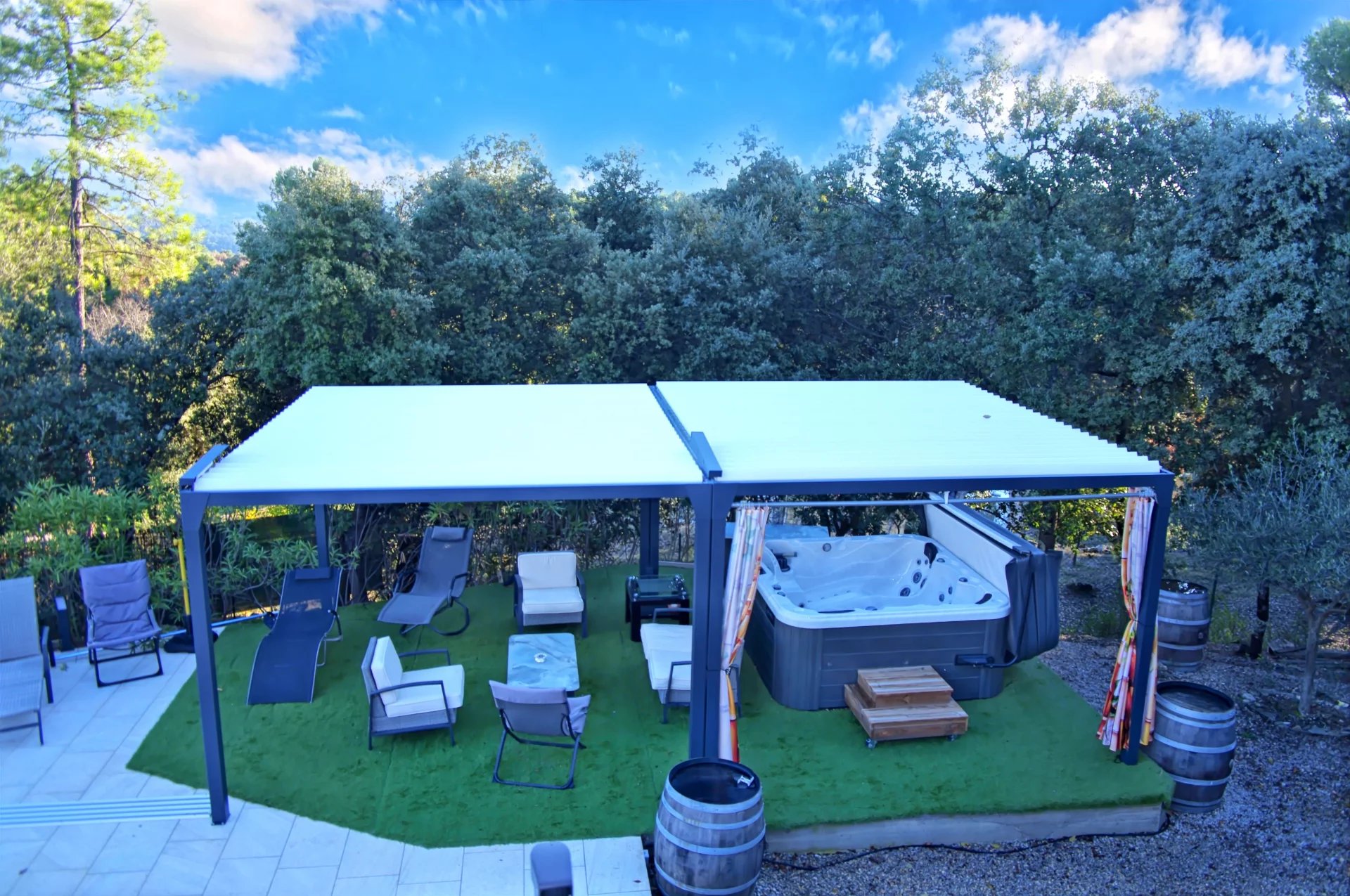 À l’extérieur, la piscine 8 x 4 avec abri récent, la pergola aménagée et la cuisine d’été composent un véritable art de vivre, en parfaite harmonie avec la nature environnante.