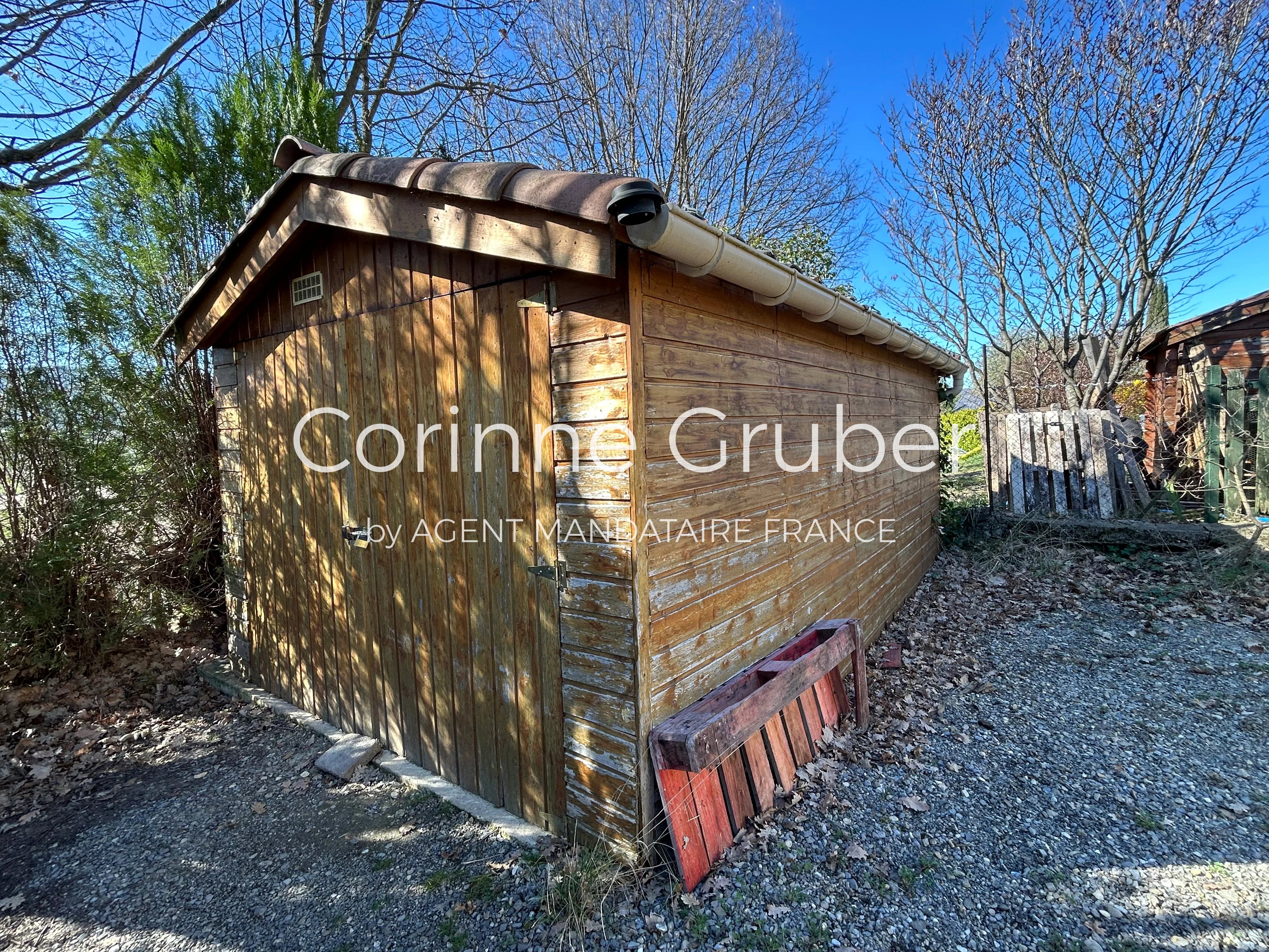 Le jardin propose deux terrasses exposées plein sud, propices à la détente, un grand abri bois pouvant accueillir une voiture, ainsi qu’un cabanon.