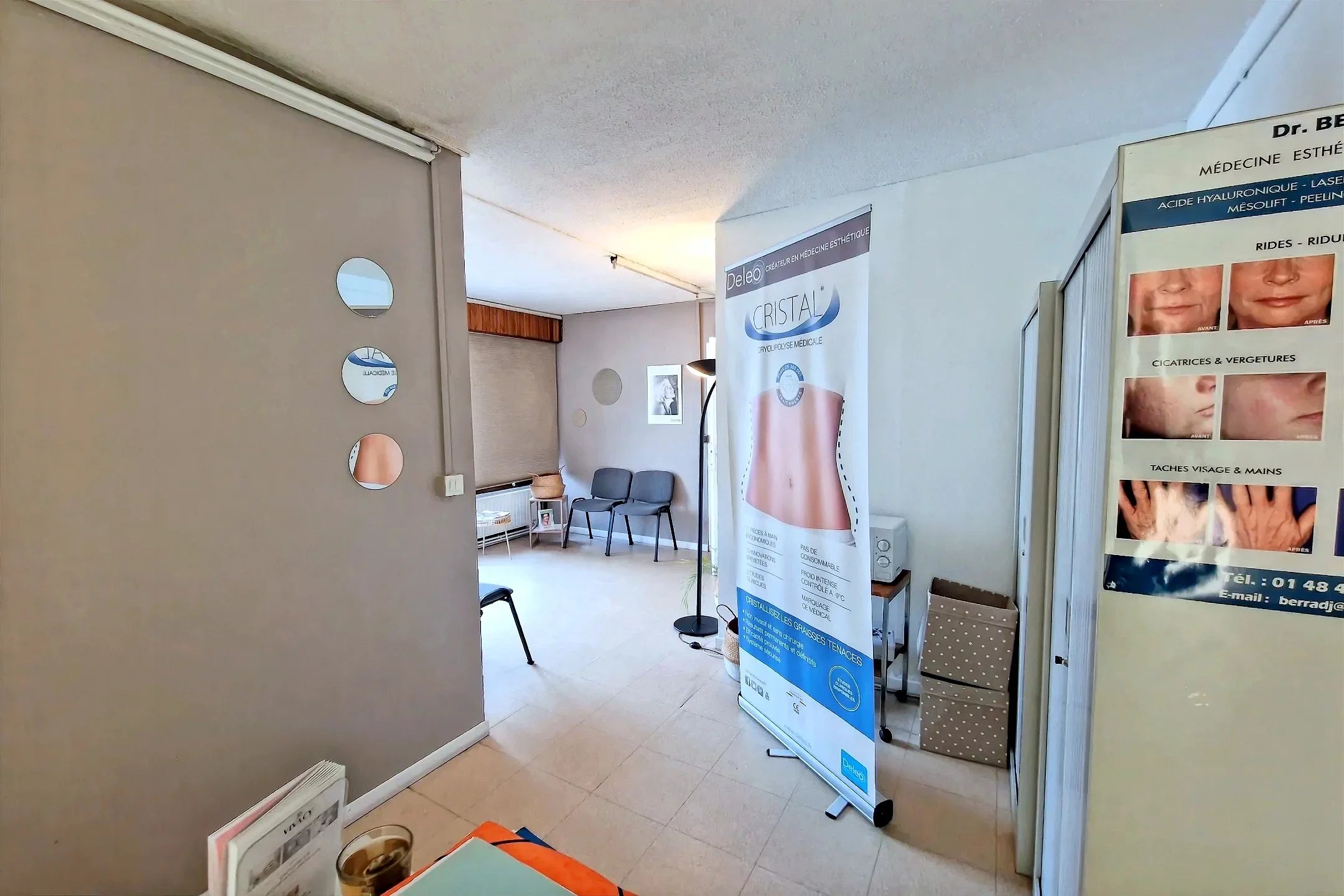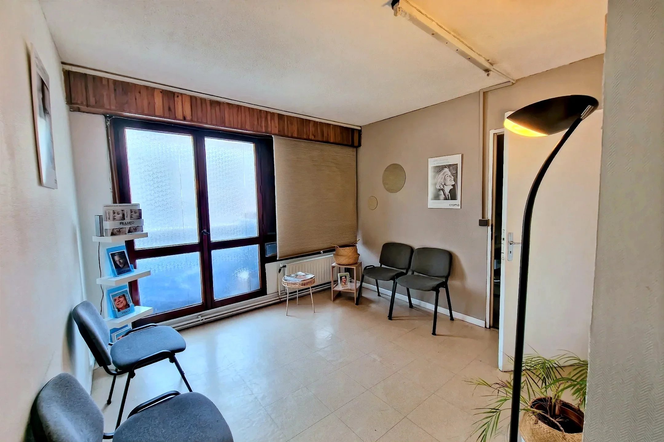 Le local se compose d’un accueil avec espace de réception, de deux salles de consultation et d’une grande pièce principale, très lumineuse grâce à de larges fenêtres.
