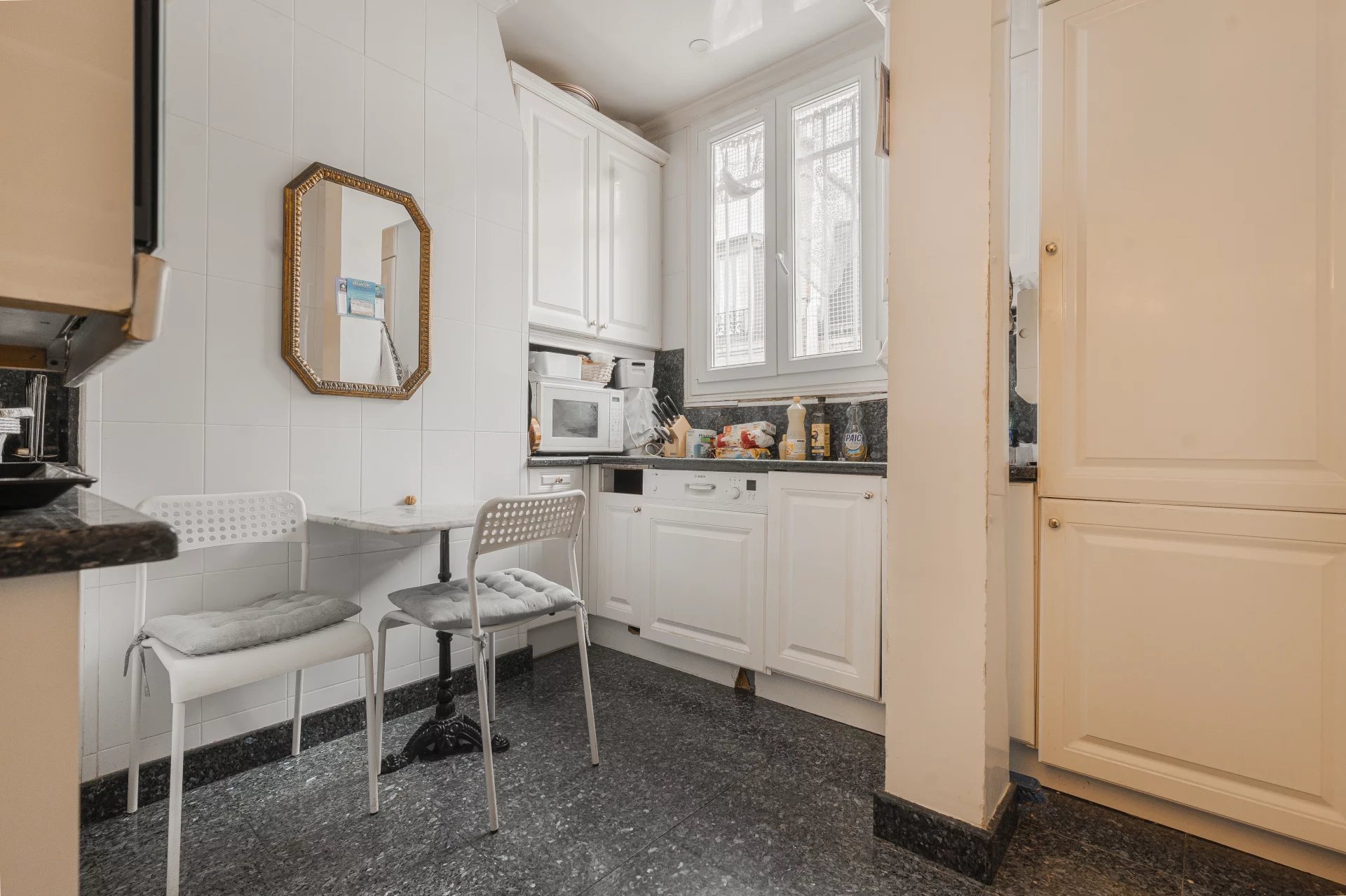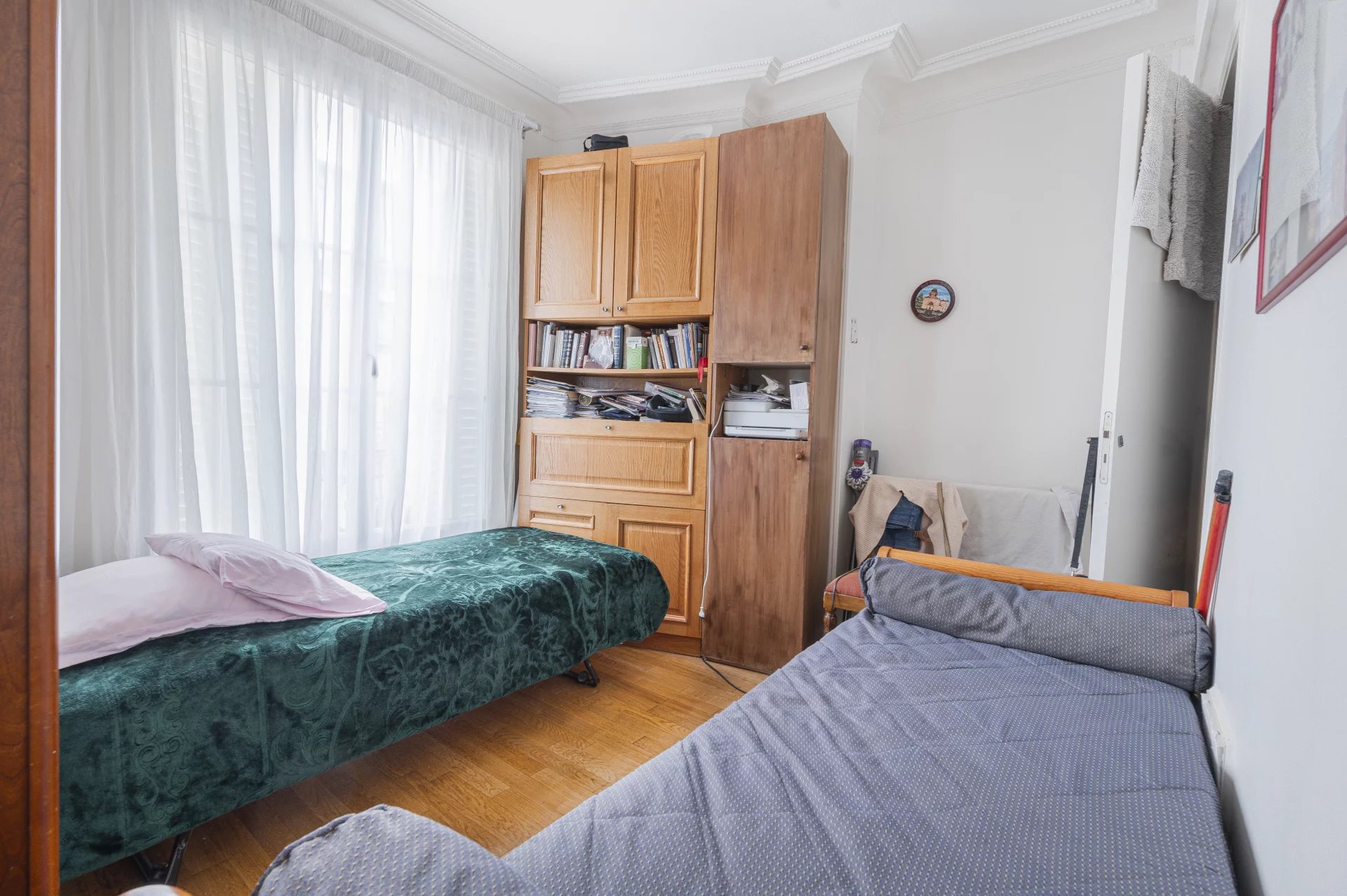 Entrée, double séjour, 2 chambres, cuisine, salle d’eau, WC séparés. Parquet, moulures, balcon. Chauffage collectif.