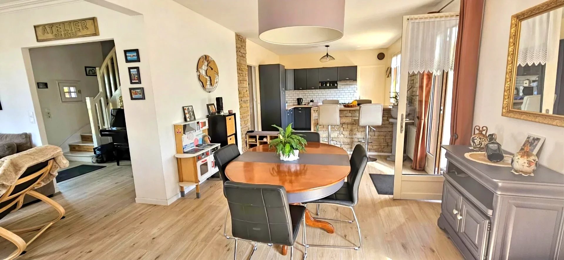 une vaste pièce de vie lumineuse intégrant séjour et cuisine équipée,