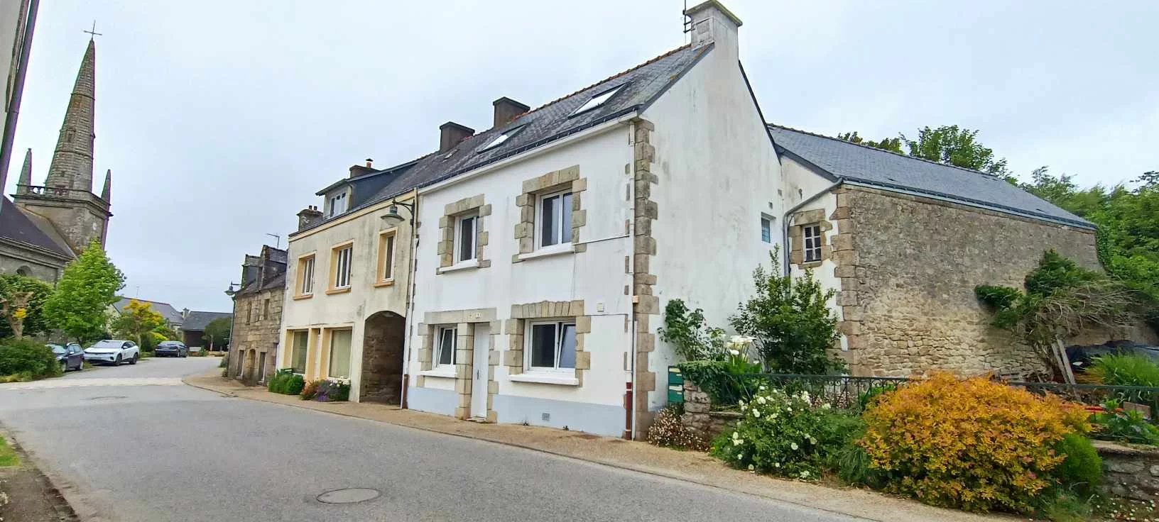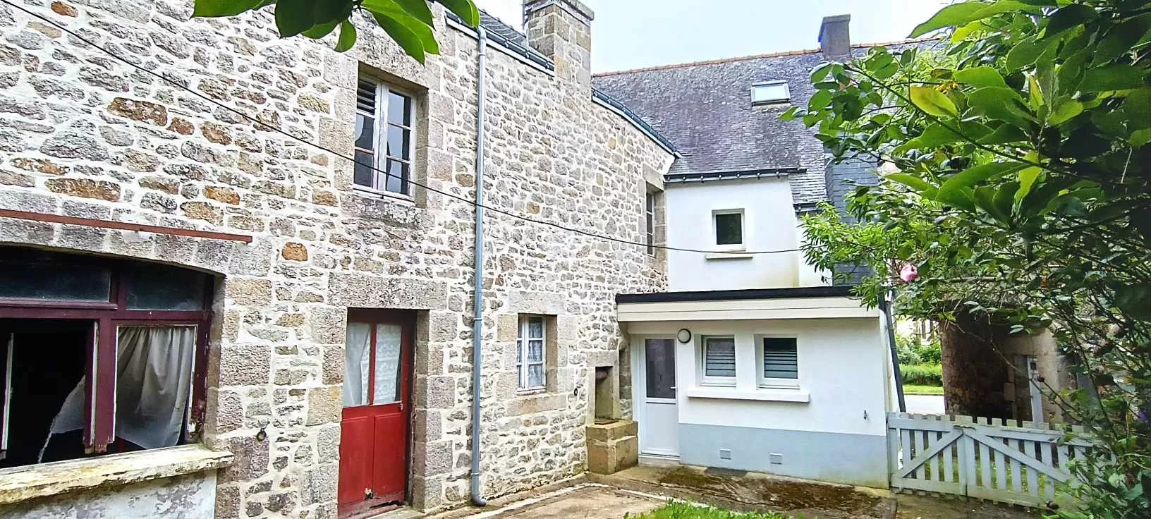 Au bourg de Guern, ensemble composée d'une habitation, d'une dépendance en pierre à rénover, d'une ruine en pierre, d'un hangar.