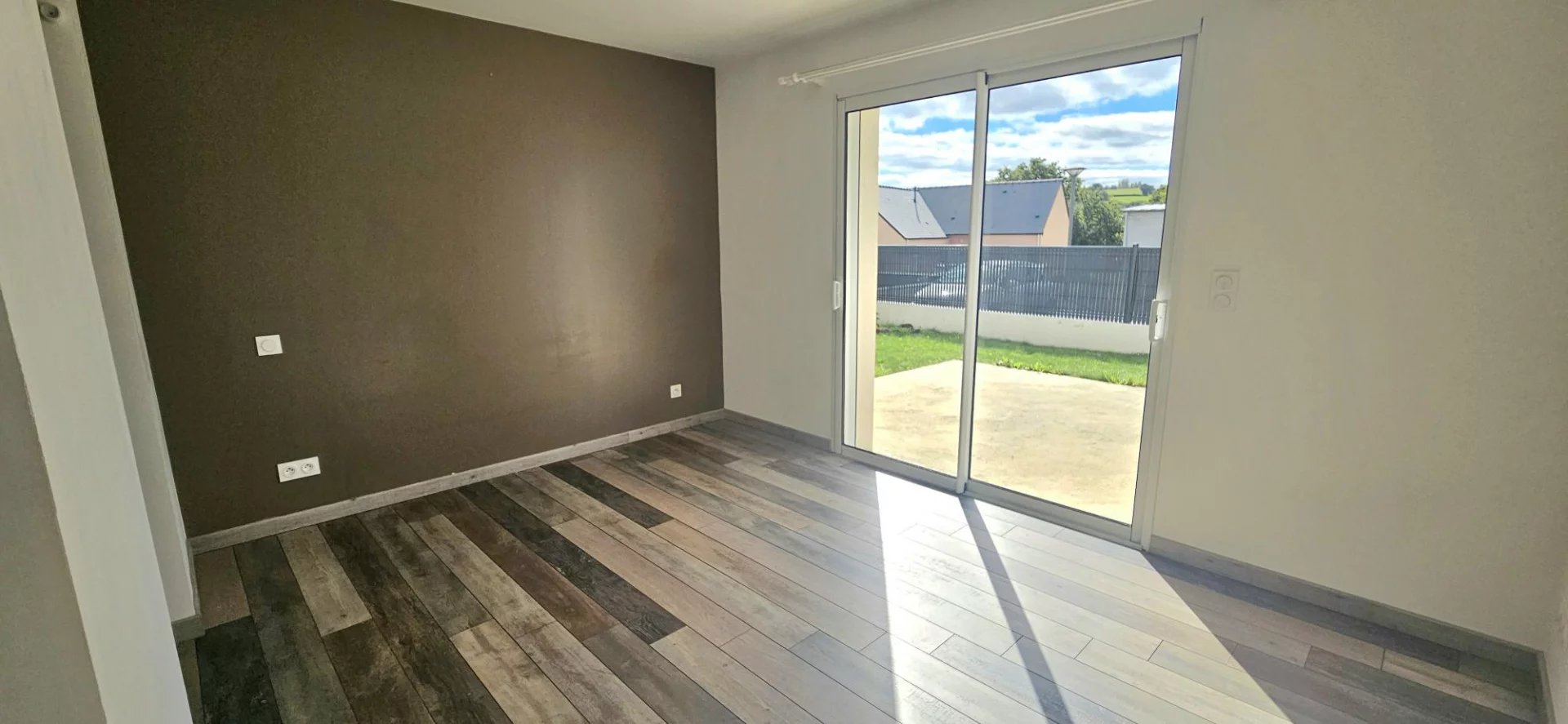 À l'extérieur : une terrasse, un jardin, une allée goudronnée, un portail d'entrée.