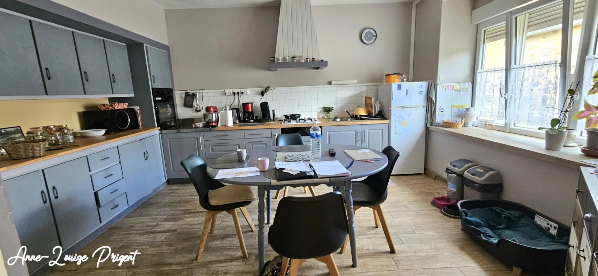 Au rez-de-chaussée : une entrée accueillante, une cuisine aménagée et équipée avec beaucoup de rangements, un lumineux séjour avec poêle à bois et un WC.