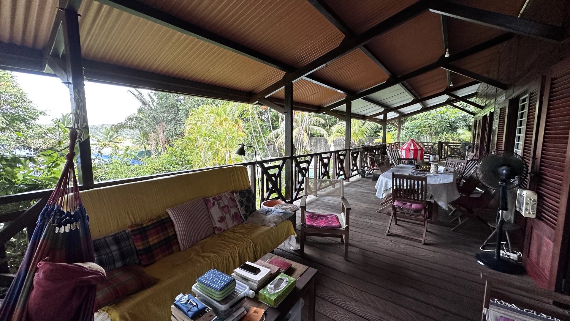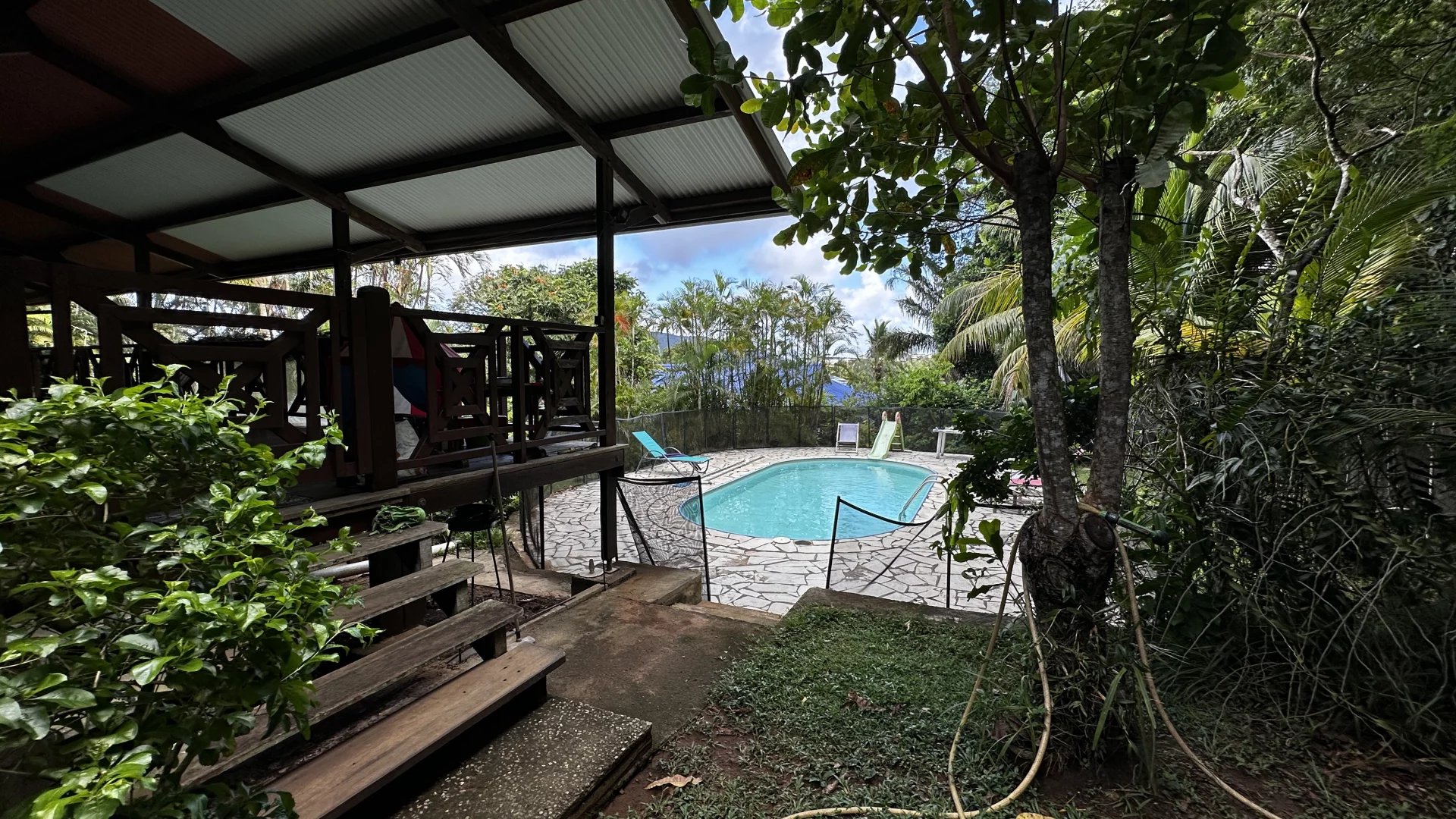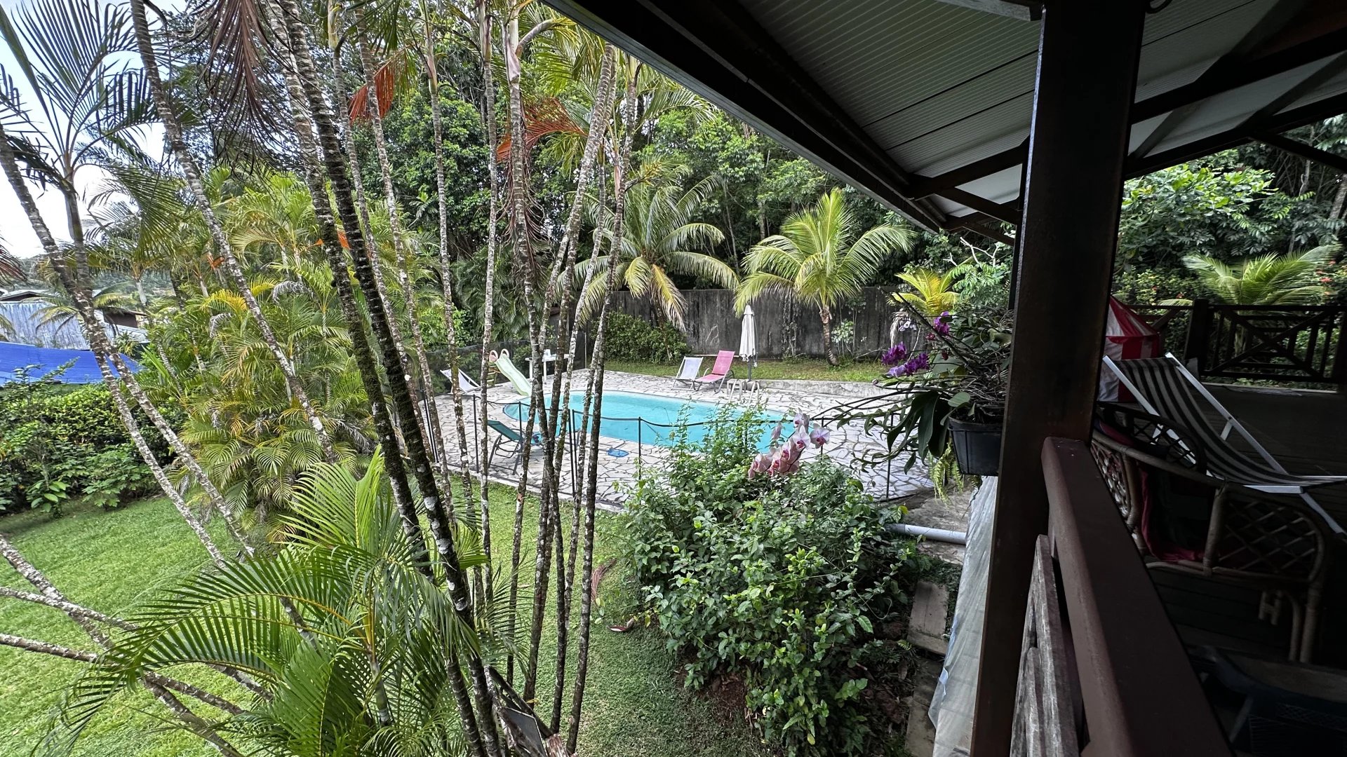 Une grande terrasse couverte dominant le jardin paysager et la piscine, idéale pour profiter des levers ou couchers de soleil,