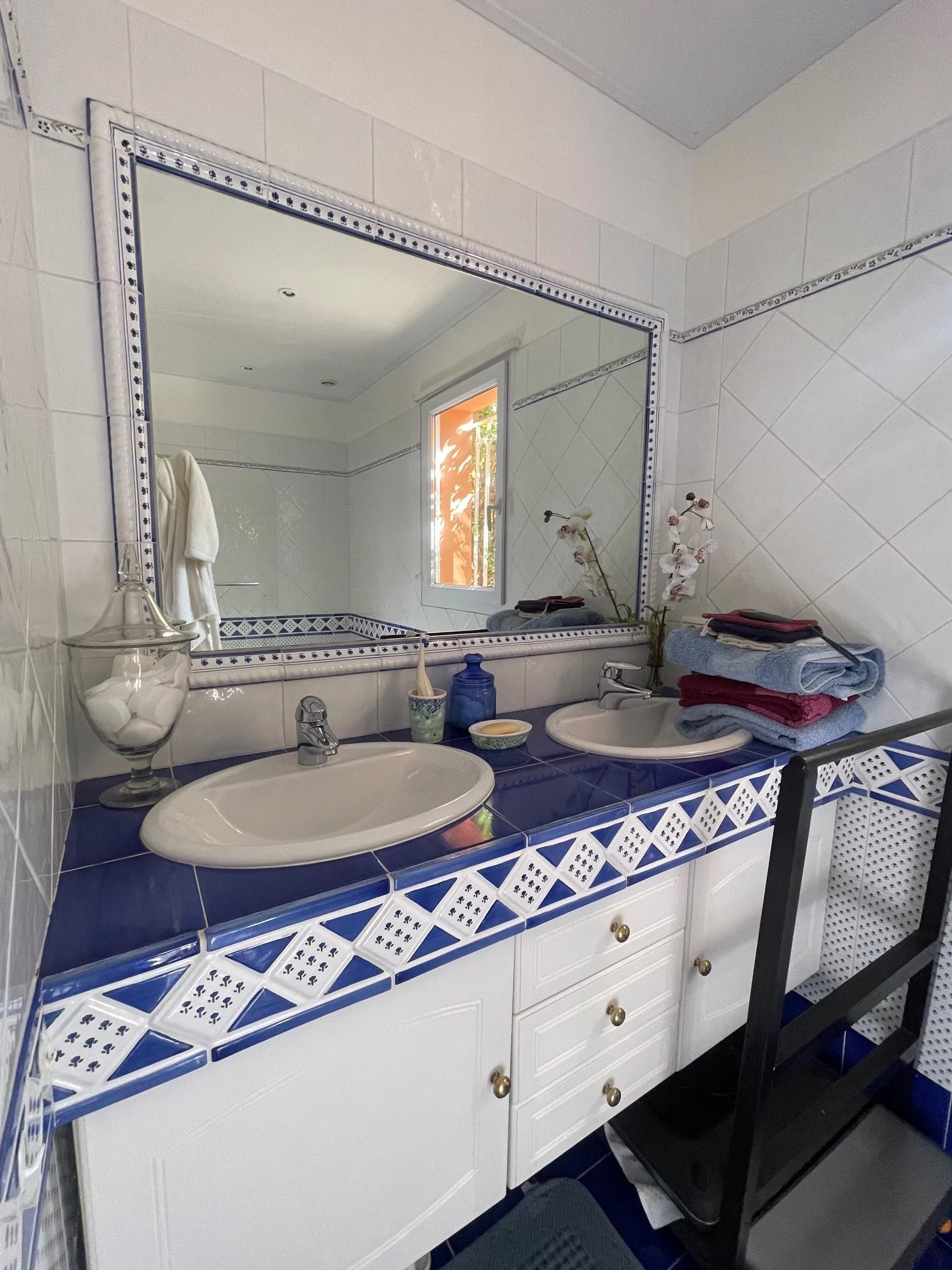 La villa principale offre de très belles prestations. Dès l’entrée, un vaste hall vous accueille et s’ouvre sur un spacieux salon-séjour baigné de lumière grâce à de grandes baies vitrées à galandage, permettant un accès direct à la terrasse et à l’espace piscine. Une cheminée double face apporte une atmosphère chaleureuse au séjour tout en communiquant avec la cuisine indépendante.