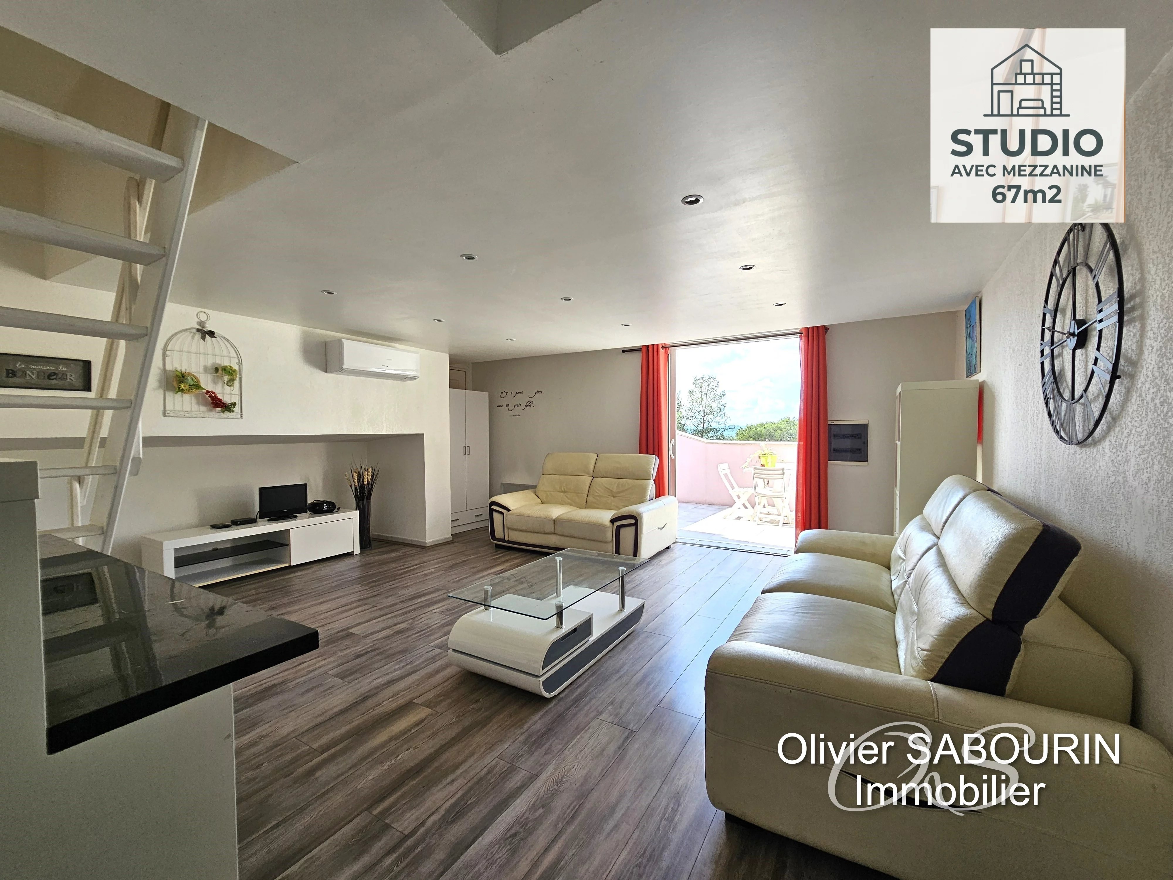 Premier studio : Spacieux de 45 m² avec un séjour de 26 m², offrant un accès direct à une terrasse de 16 m² avec vue sur le rocher de Roquebrune, une salle de bains avec WC, et deux coins nuit sous toiture (15 m² et 7 m² au sol).