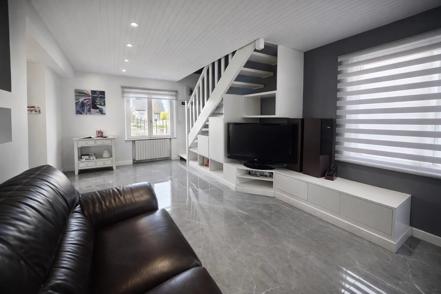 Une salle d’eau moderne avec douche à l’italienne et WC suspendu, une chaufferie-buanderie, ainsi qu’un WC séparé se trouvent également au rez-de-chaussée.