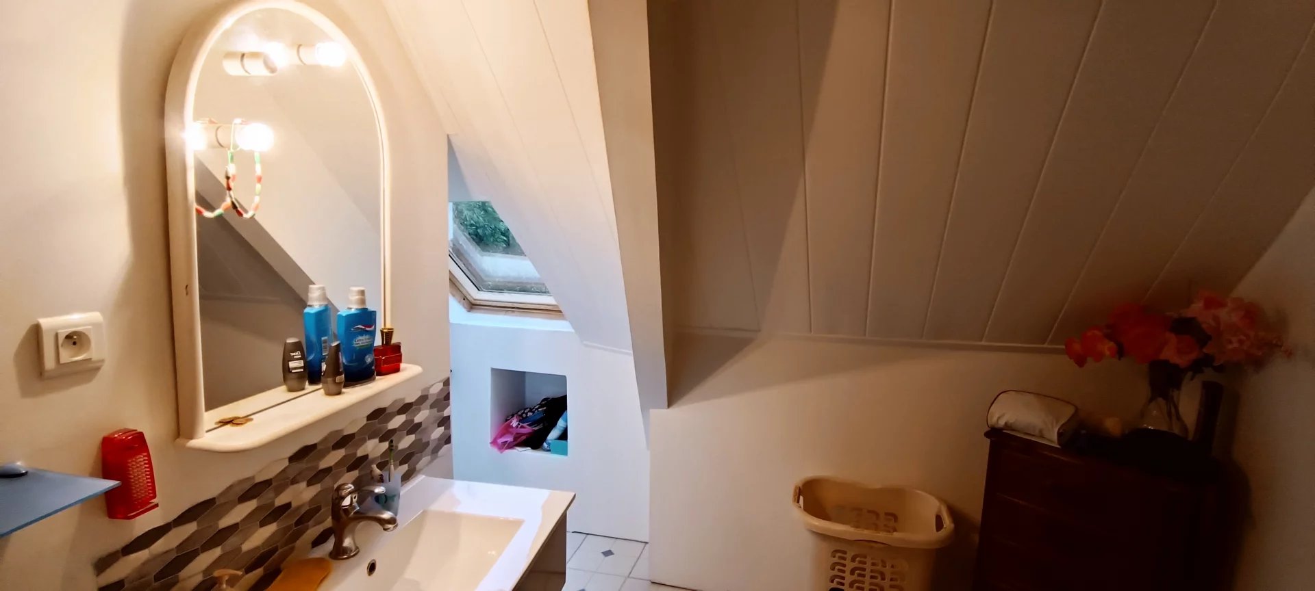 Équipements : production d’eau chaude sanitaire par ballon électrique, isolation des murs par 20 cm de laine de verre, menuiseries PVC double vitrage…
