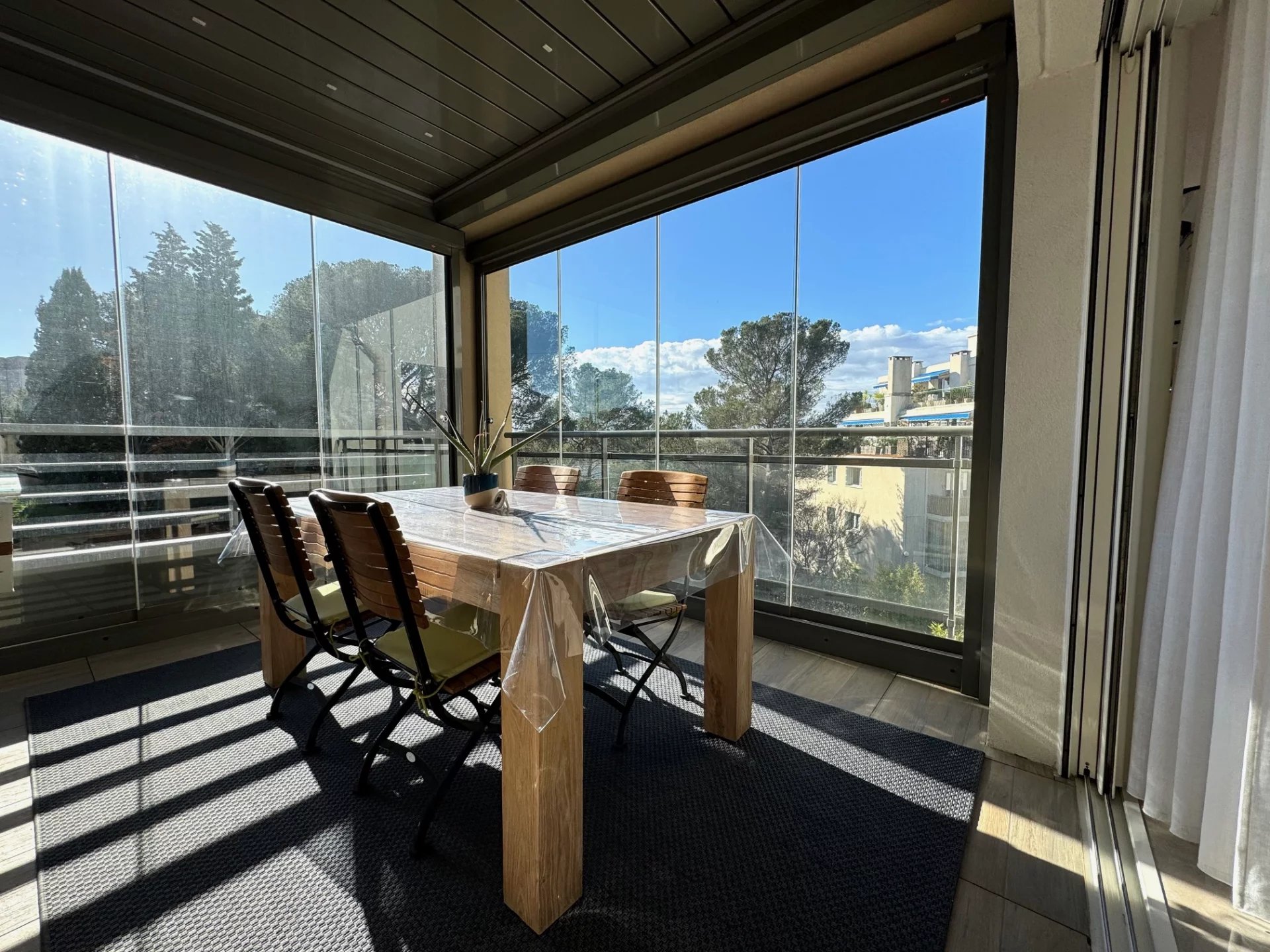 Climatisation dans tout l’appartement, menuiseries en aluminium, baie vitrée à galandage dans le salon.