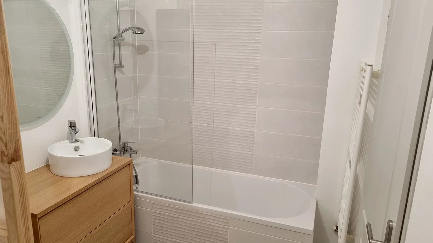 • 1 salle de bain avec une buanderie astucieusement aménagée derrière un panneau coulissant.