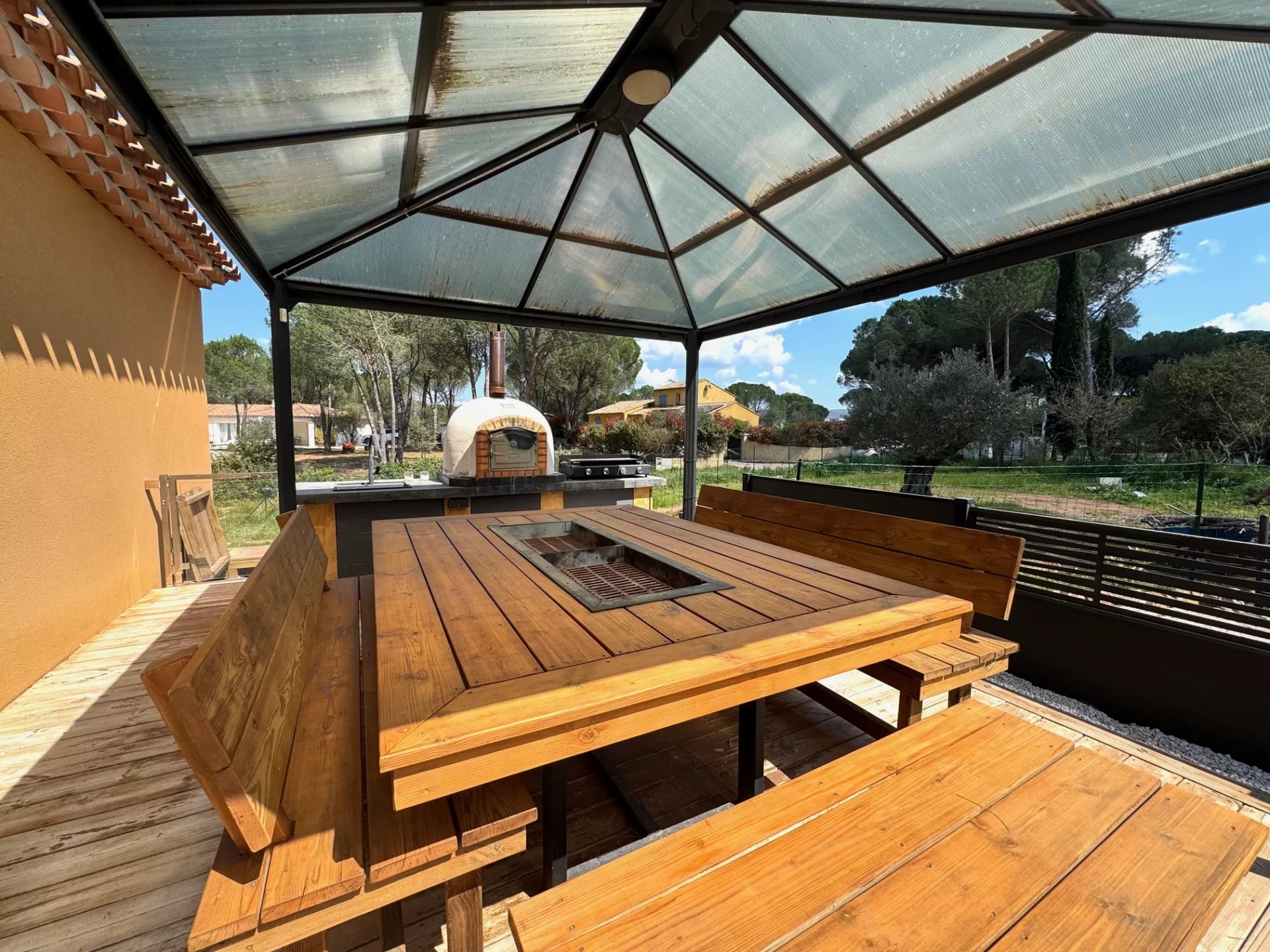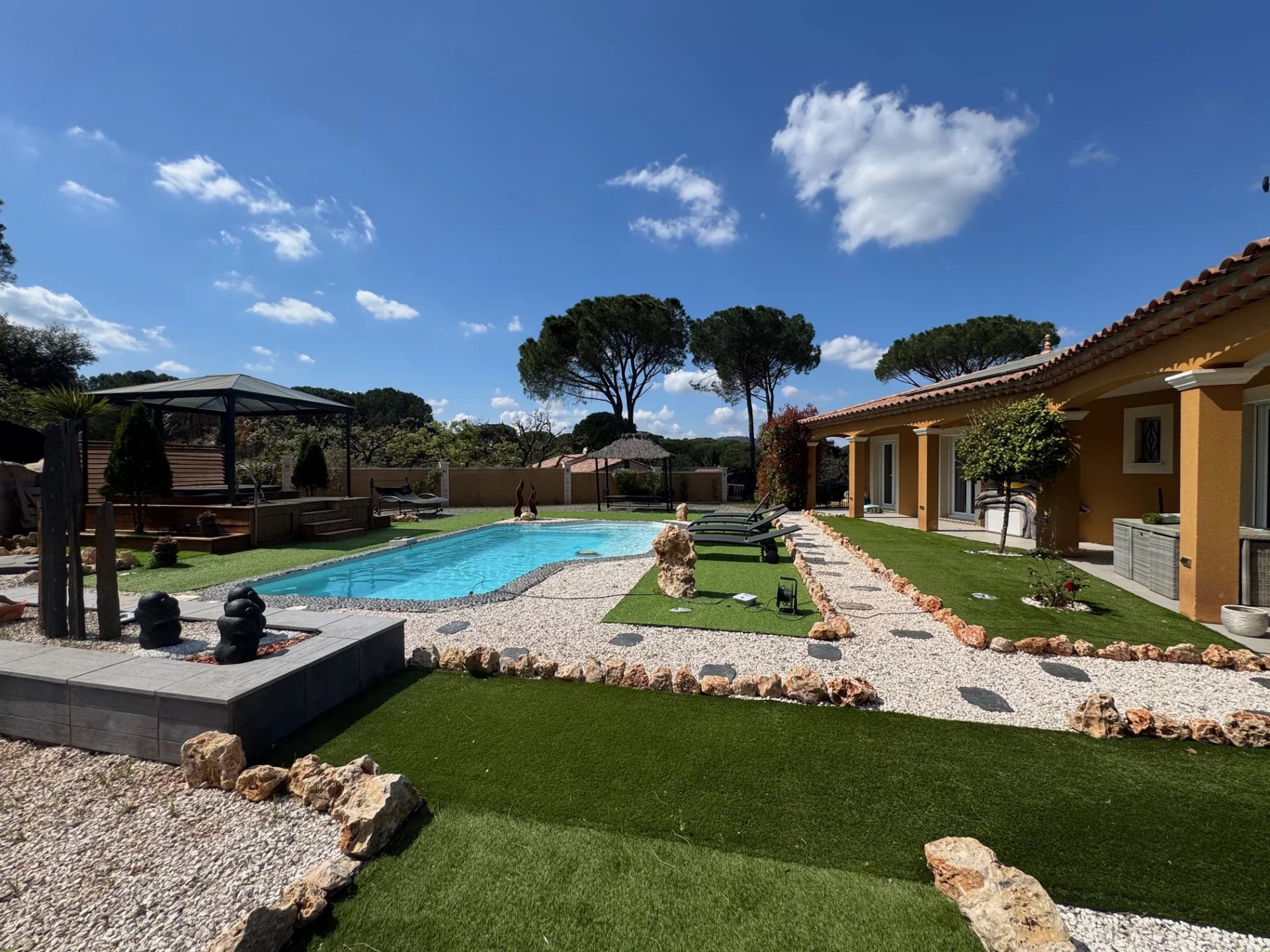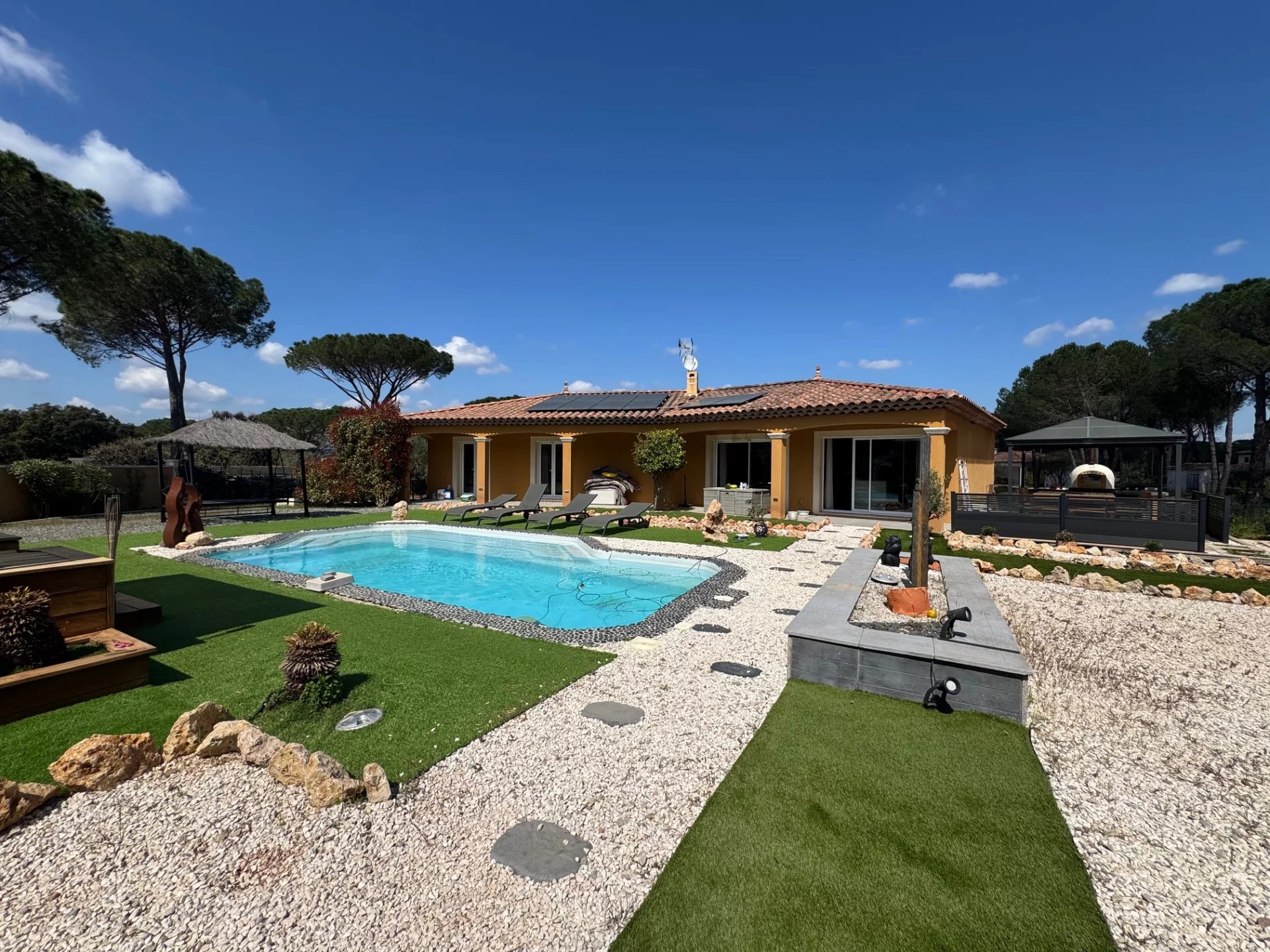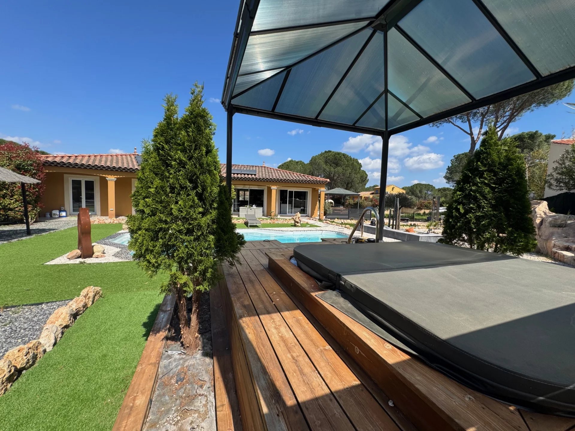 Les plus : entièrement climatisée, piscine 8 x 4, jacuzzi, espace barbecue avec four à pizza, buanderie, terrasse couverte.